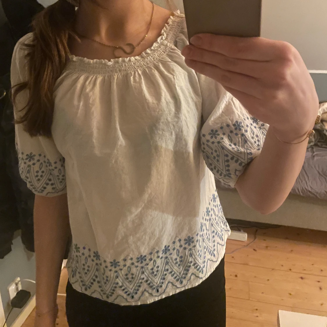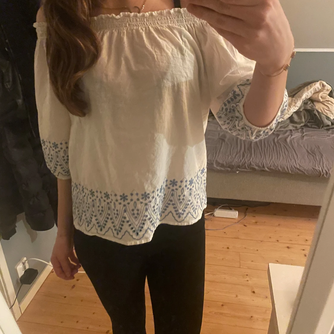 Vit offshoulder blus med blå broderier, inga defekter, storlek XS