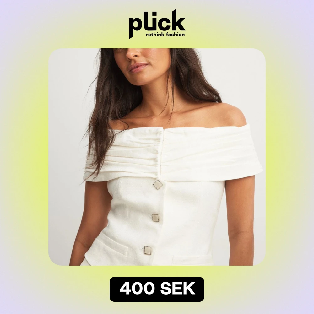 Säljer en elegant vit offshoulder topp från NA-KD. Toppen har en stilren design med fyrkantiga knappar framtill och en vacker draperad krage. Perfekt för sommarens fester eller en stilfull middag.