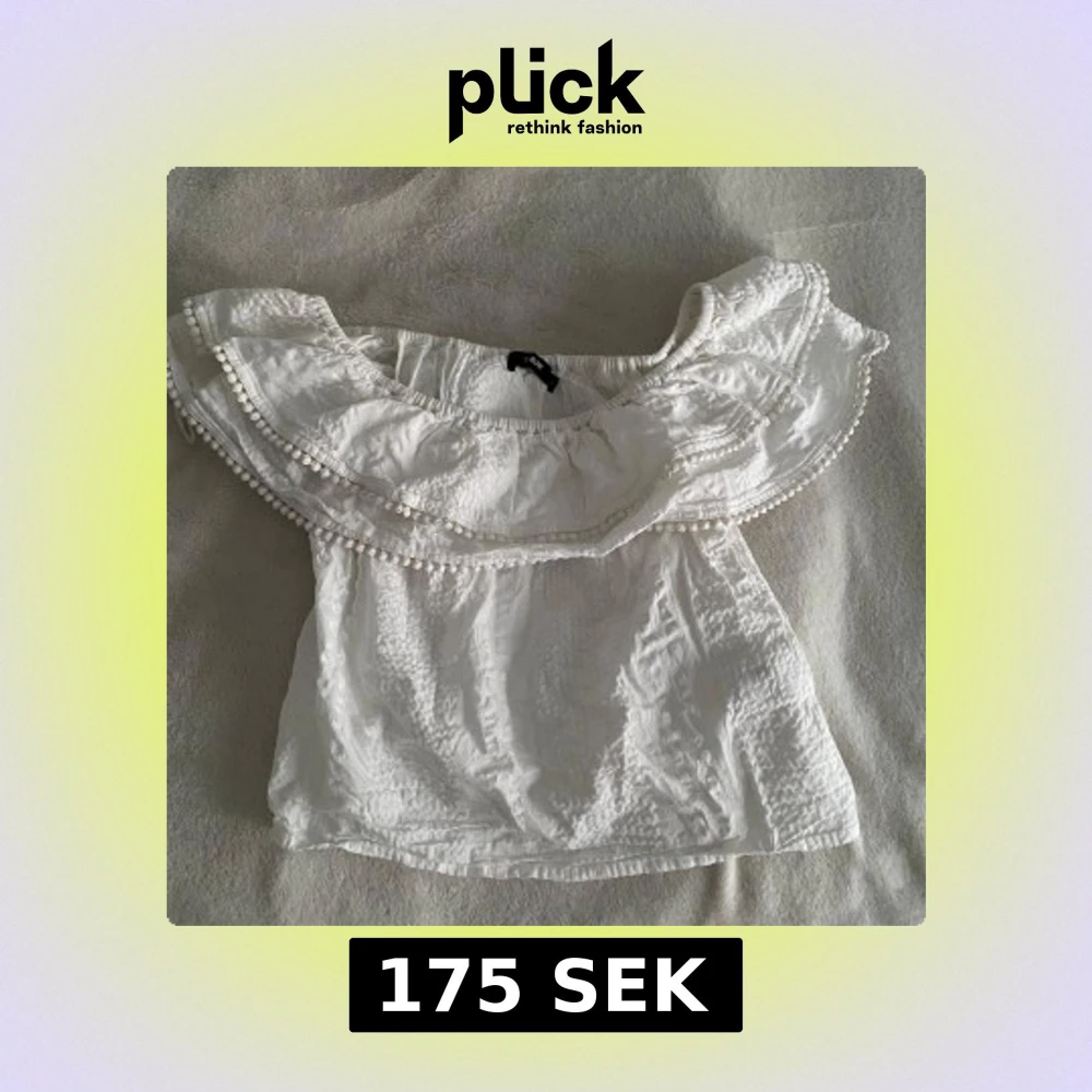 Säljer en vit offshoulder topp från Bik Bok med dubbla volanger och små bollar längs kanten. Resår upptill för bra passform. Säljer då jag aldrig använt den. Köpt här på Plick!!