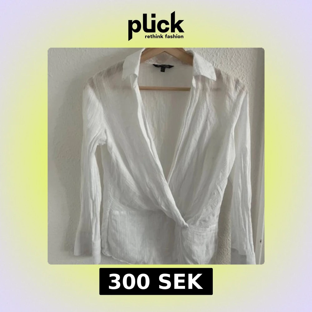 Säljer en stilren vit omlottblus från Massimo Dutti med krage och långa ärmar. Blusen har subtila ränder i tyget och en fin detalj i midjan för en snygg passform. Perfekt för dig som gillar klassisk och fräsch stil. Perfekt till sommaren och passar så bra till ett par jeans eller kjol.