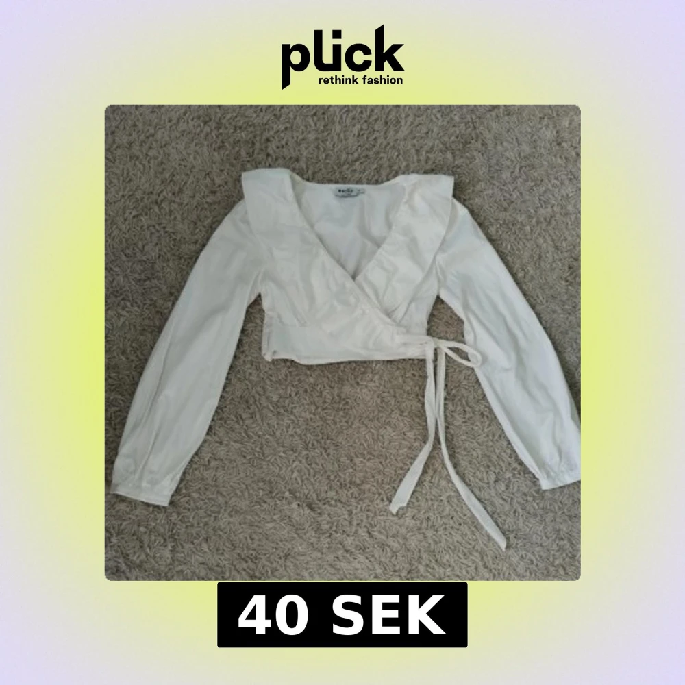 Säljer en vit omlottopp från NA-KD med långa ärmar och volangkant längs v-ringningen. Toppen är croppad och knyts i sidan för en snygg passform. Tillverkad i bomull och har knappar vid ärmsluten. Storlek 34!