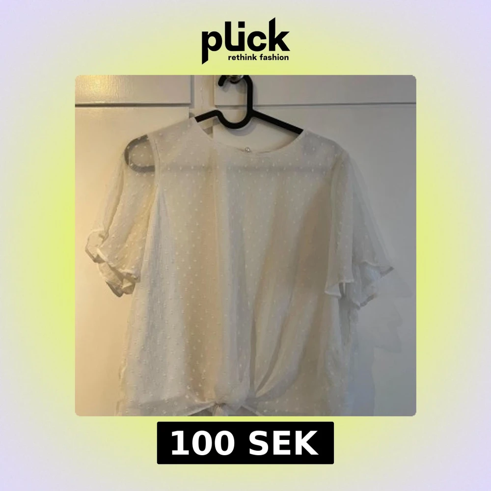 Säljer en söt vit blus från Lindex med diskret prickigt mönster och transparenta, luftiga korta ärmar. Blusen har en pärlknapp i nacken och en knytning framtill. Storleken är kids 158/164 sitter som xs/s