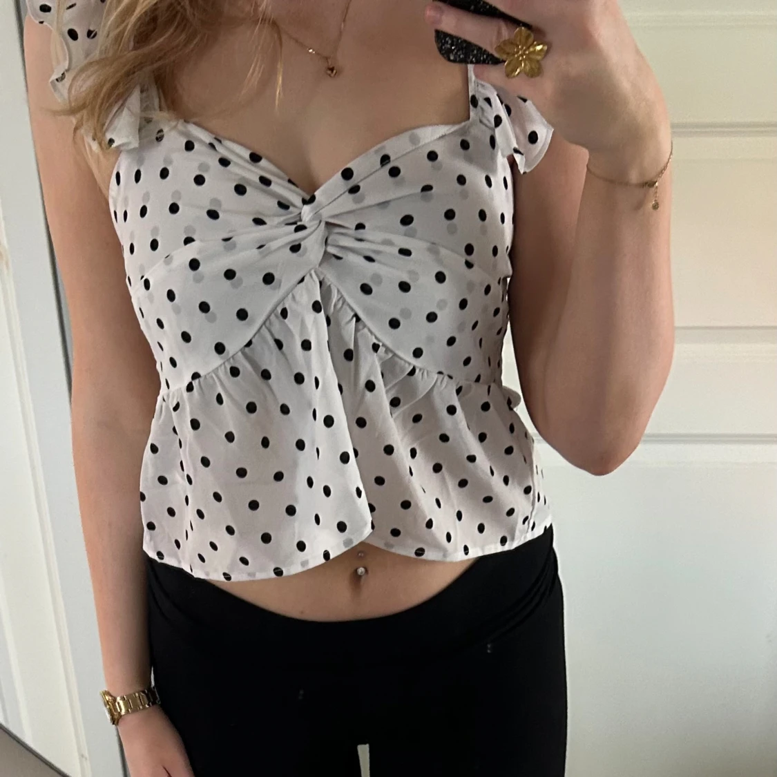 Vit söt prickig topp i fint skick. Volang upptill
