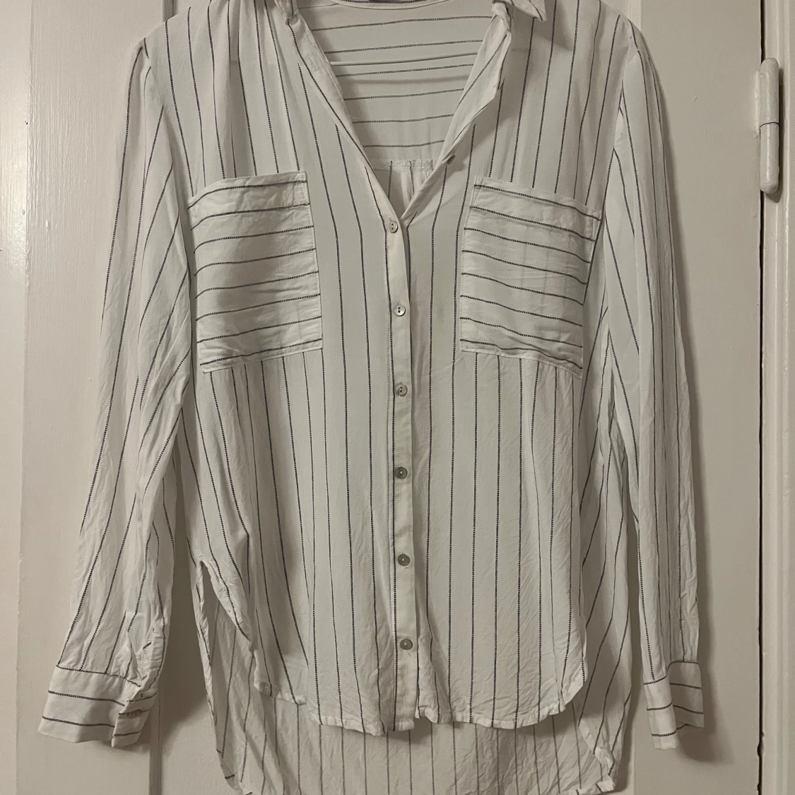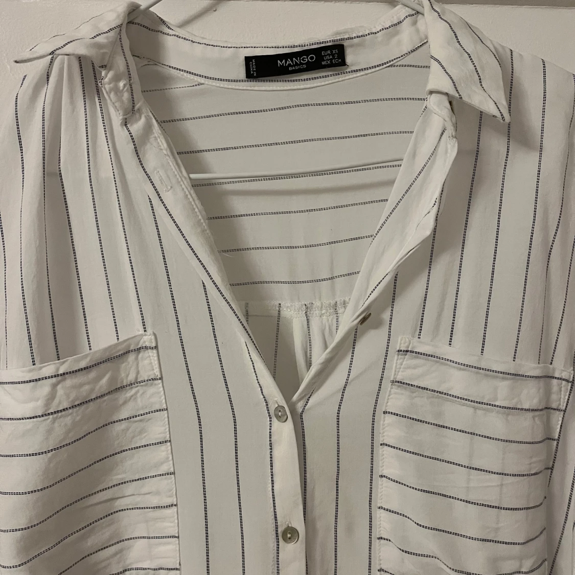 Snygg vit skjorta från Mango med svarta ränder och två bröstfickor. Skjortan har långa ärmar och knappar framtill. Perfekt för en stilren look.