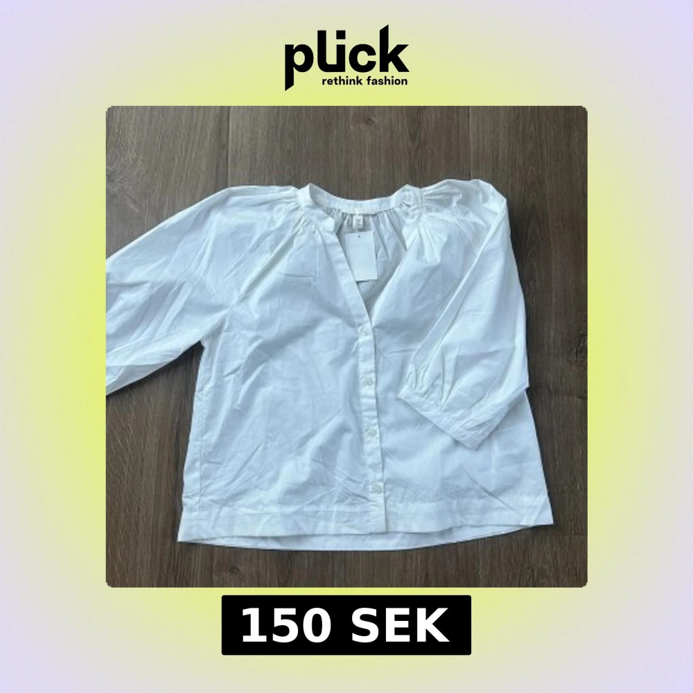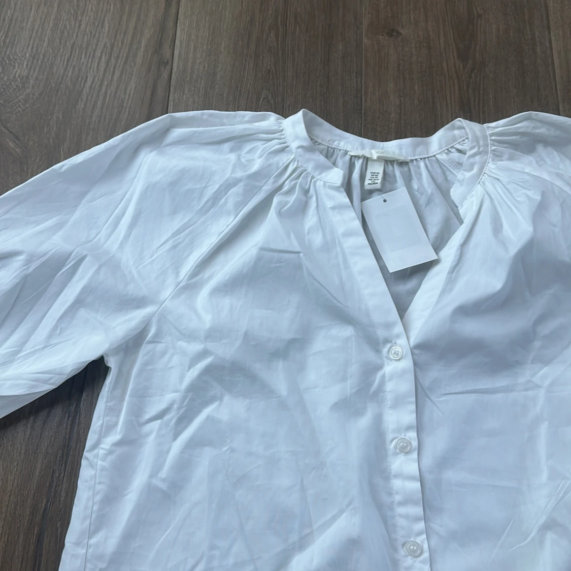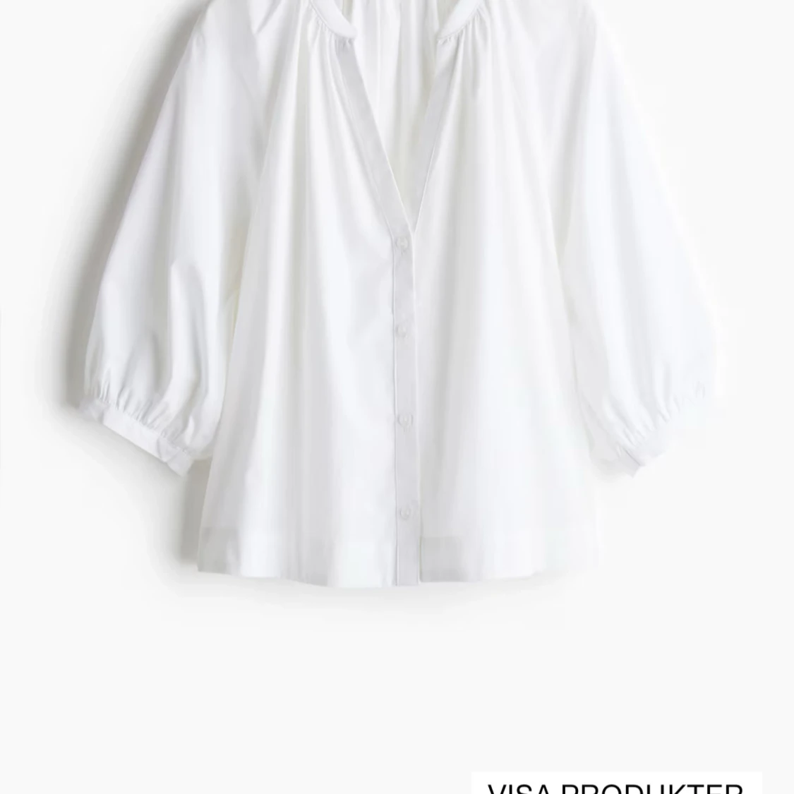 Snygg vit skjorta från H&M med puffiga trekvartsärmar och knappar framtill. Skjortan har en avslappnad passform och är tillverkad i mjuk bomull. Perfekt för dig som gillar stilrena och enkla plagg med en twist.