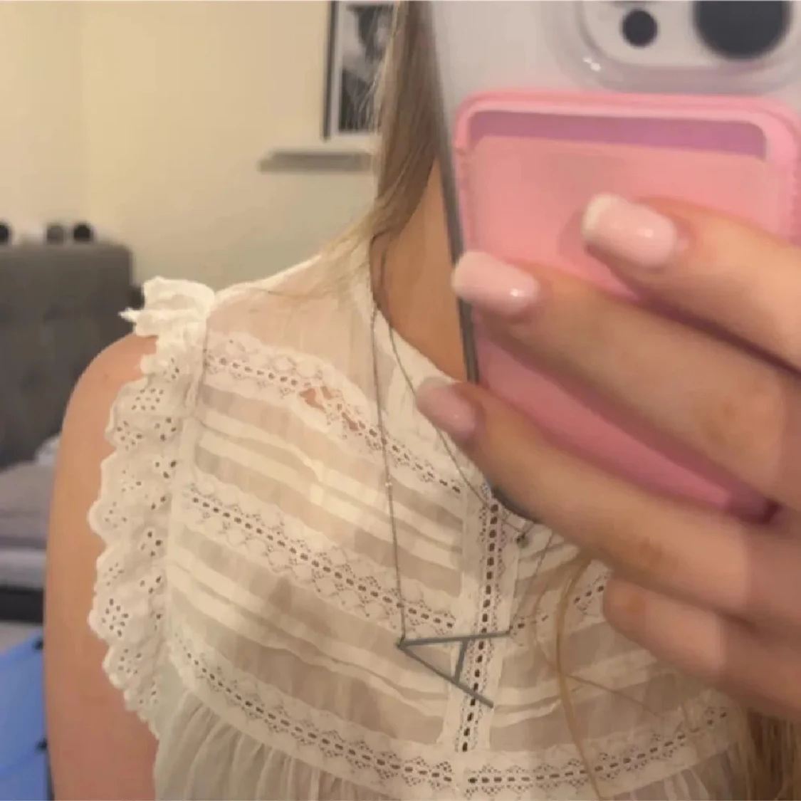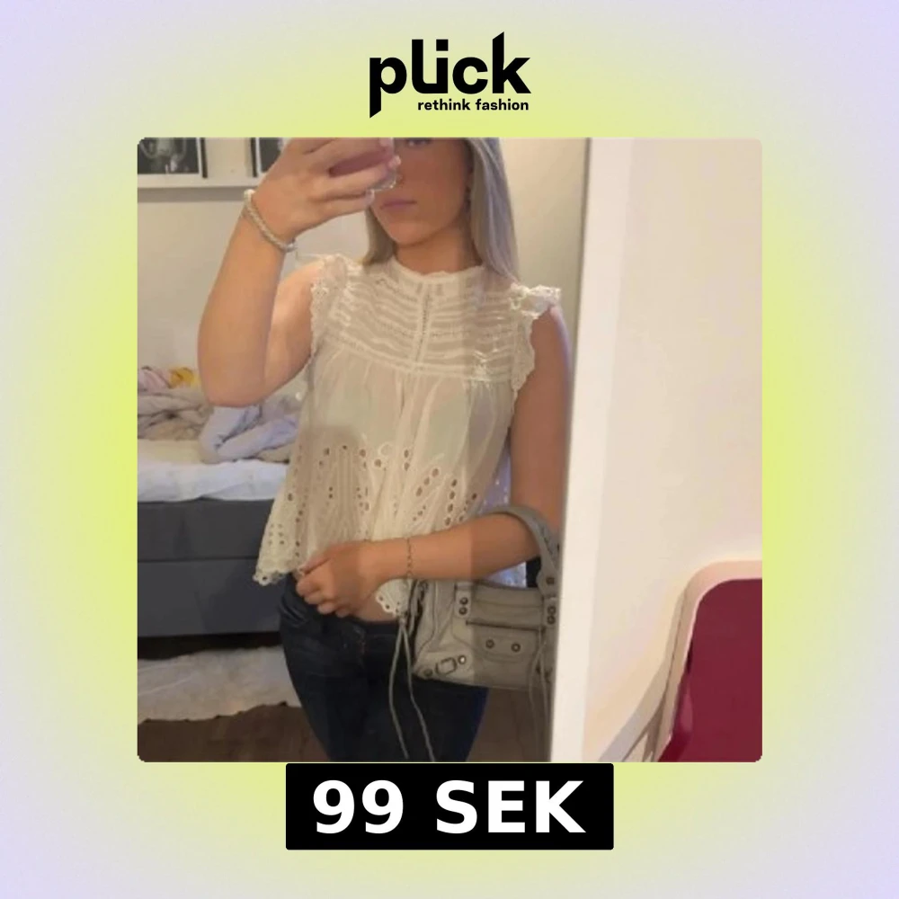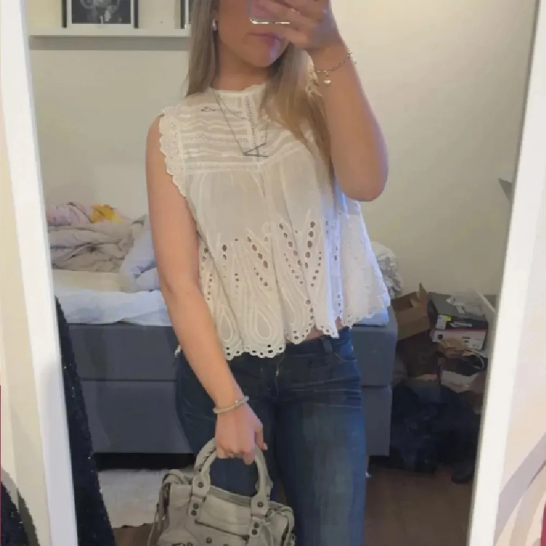 Säljer en söt vit blus med spetsdetaljer och broderier. Typ i linne tyg och så skön💕 Se bild 3 för defekten vid axeln💓
