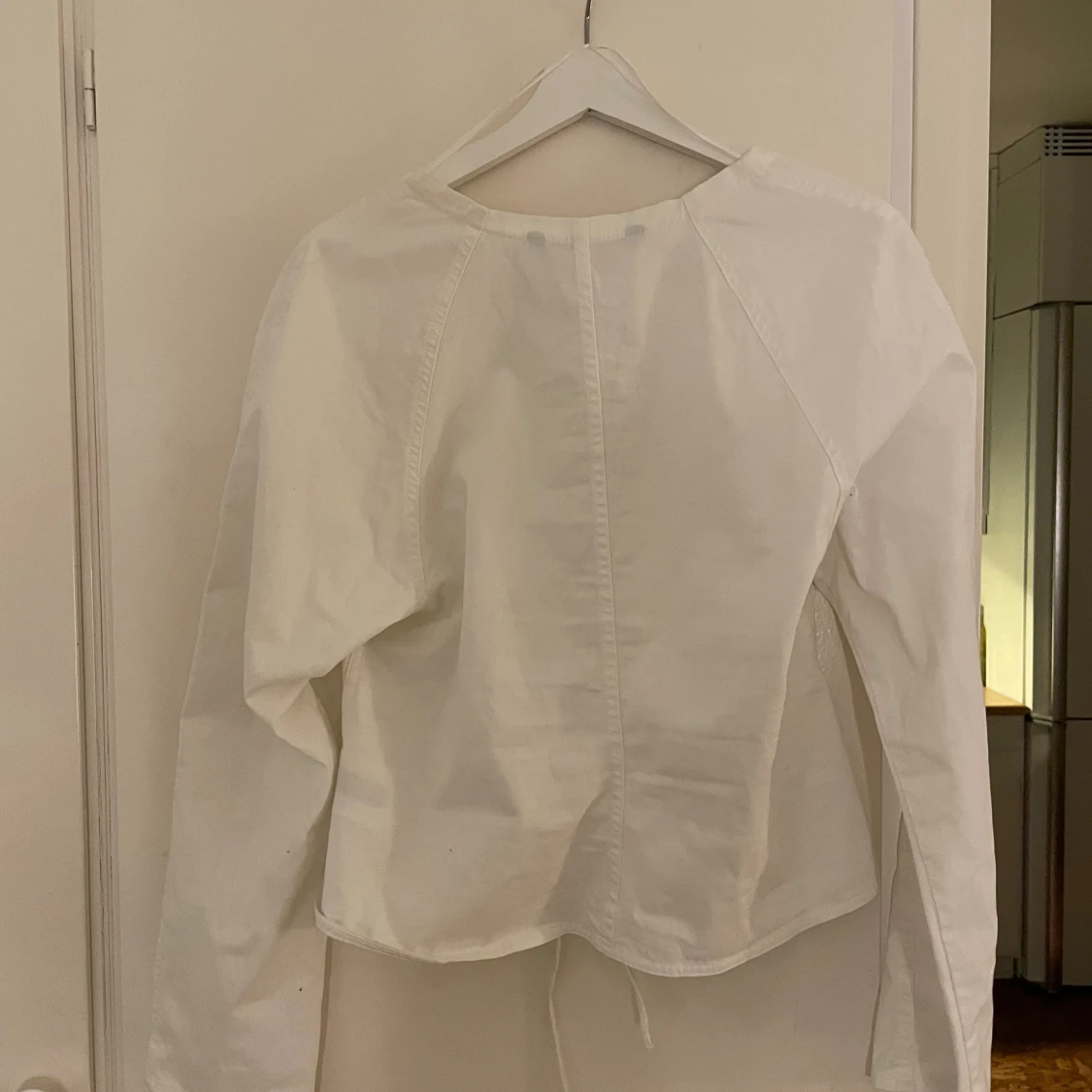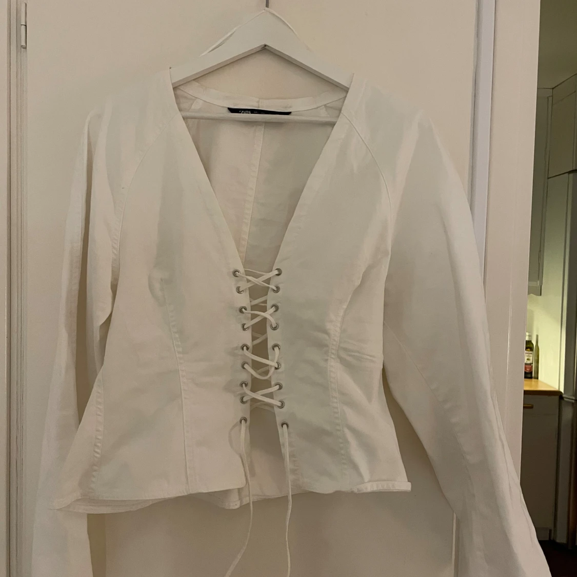 Vit topp med snörning från Zara men köpt på vinted. Endast testad💕 märkt som storlek l men skulle säga att det är en s🌸 (första bilden är lånad)