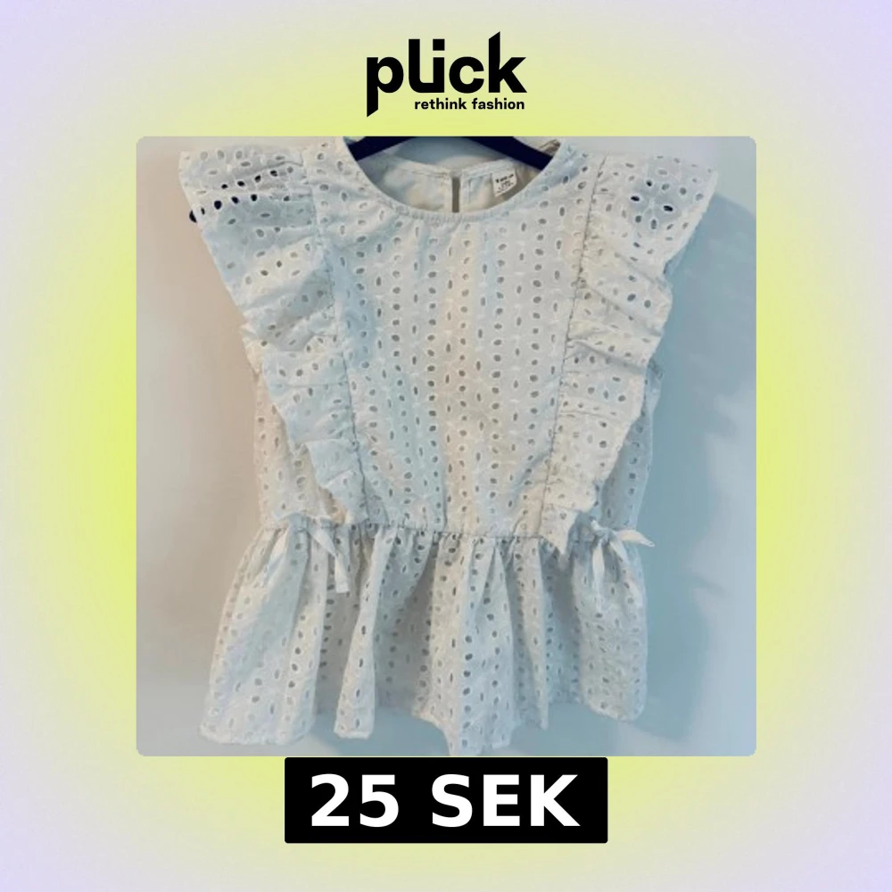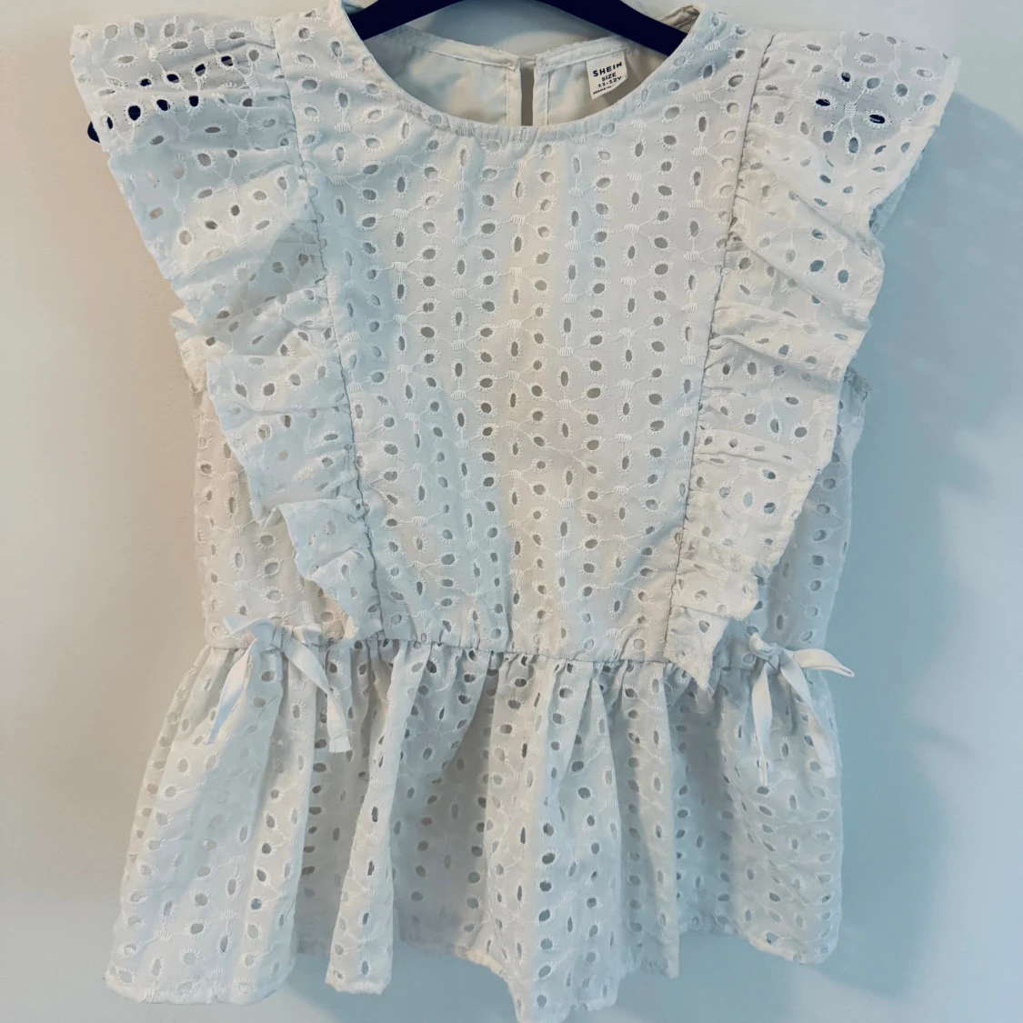 Supersöt vit klänning från SHEIN med broderade hålmönster, volanger längs axlarna och små knytband i midjan.
