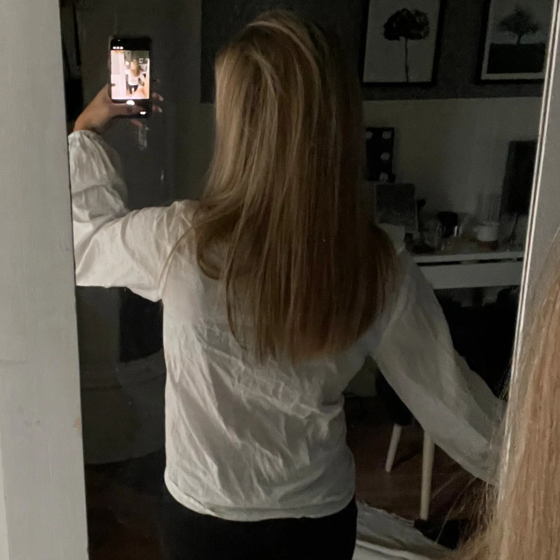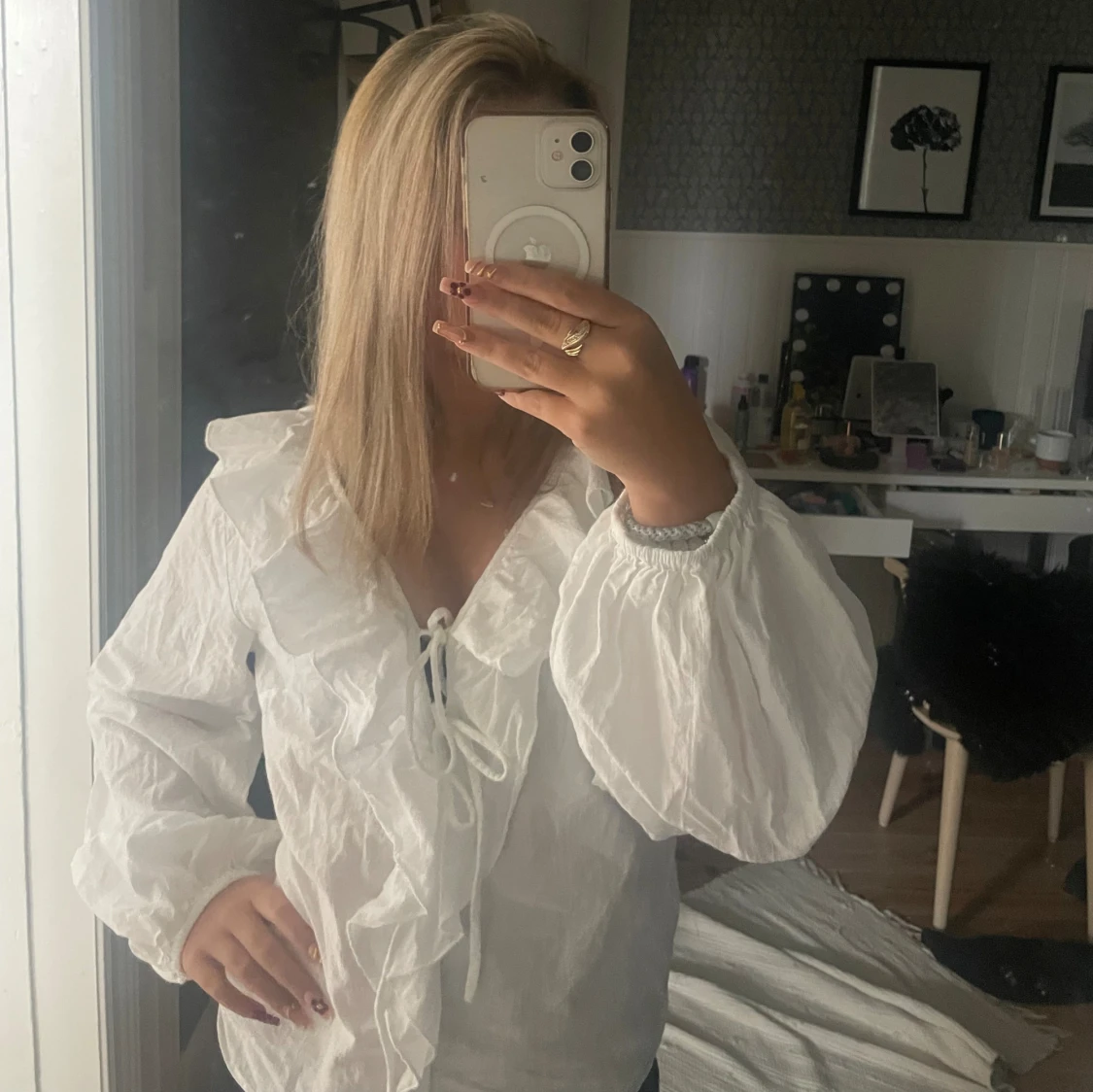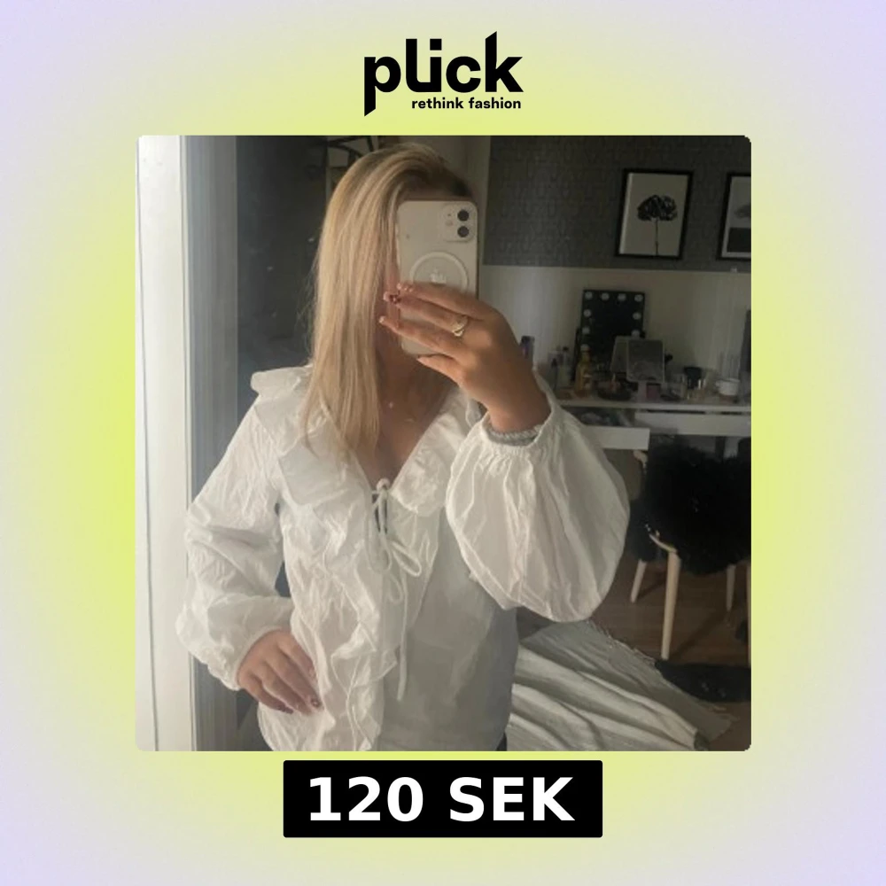 Aldrig använt. Säljer en vit skjorta från 157 i storlek S. Skjortan har långa puffärmar, volangdetaljer längs v-ringningen och snörning framtill. Tillverkad i ett lätt och luftigt bomullstyg.