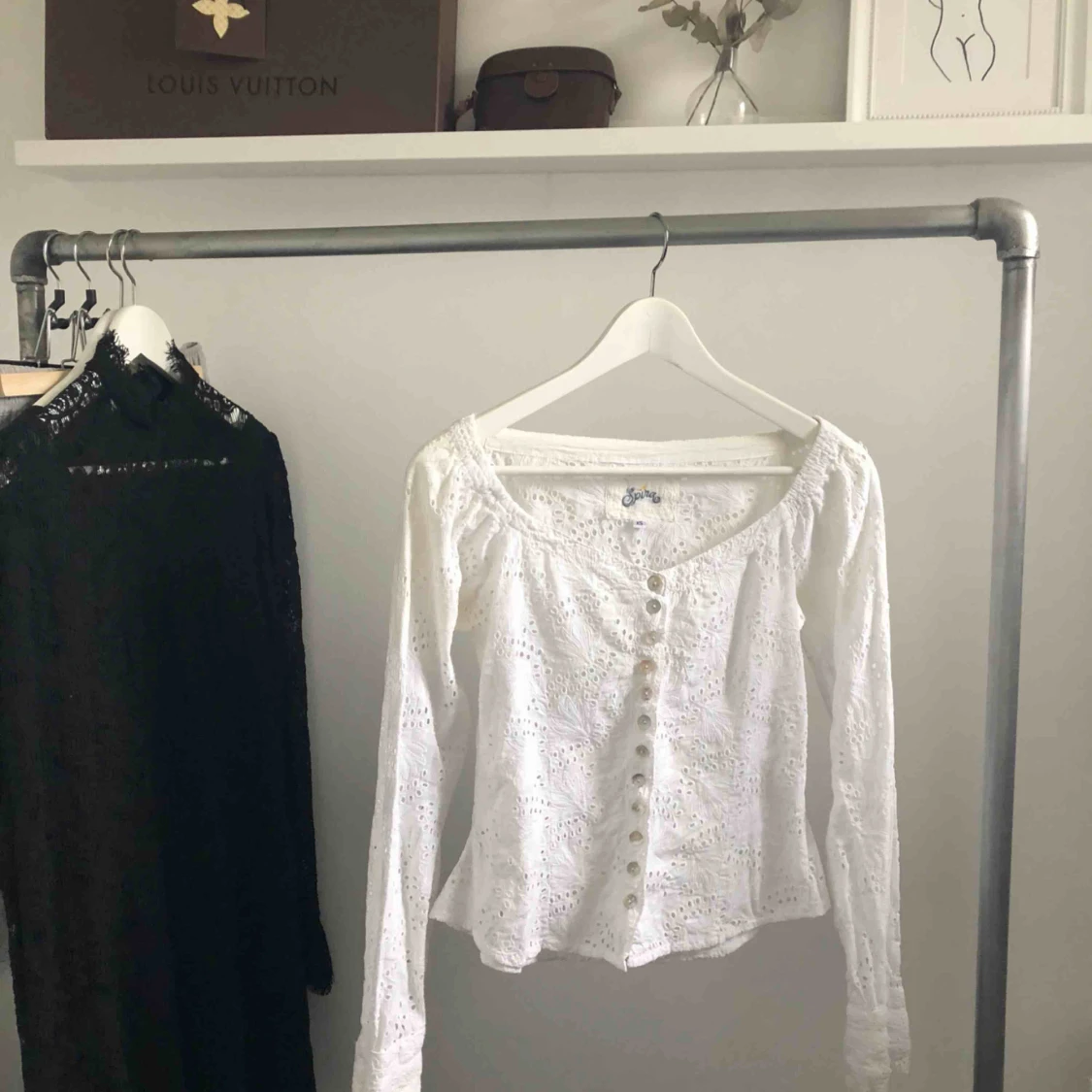 Figursydd broderie anglaise blus från spira/fira med dekorativa knappar fram och vid ärmslutet. Passar storlek XS-S. Köparen står för frakten.