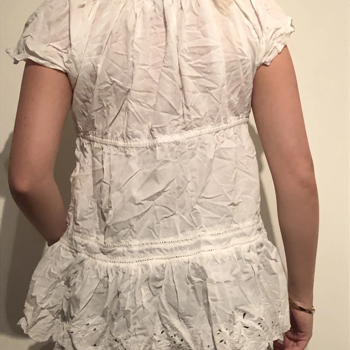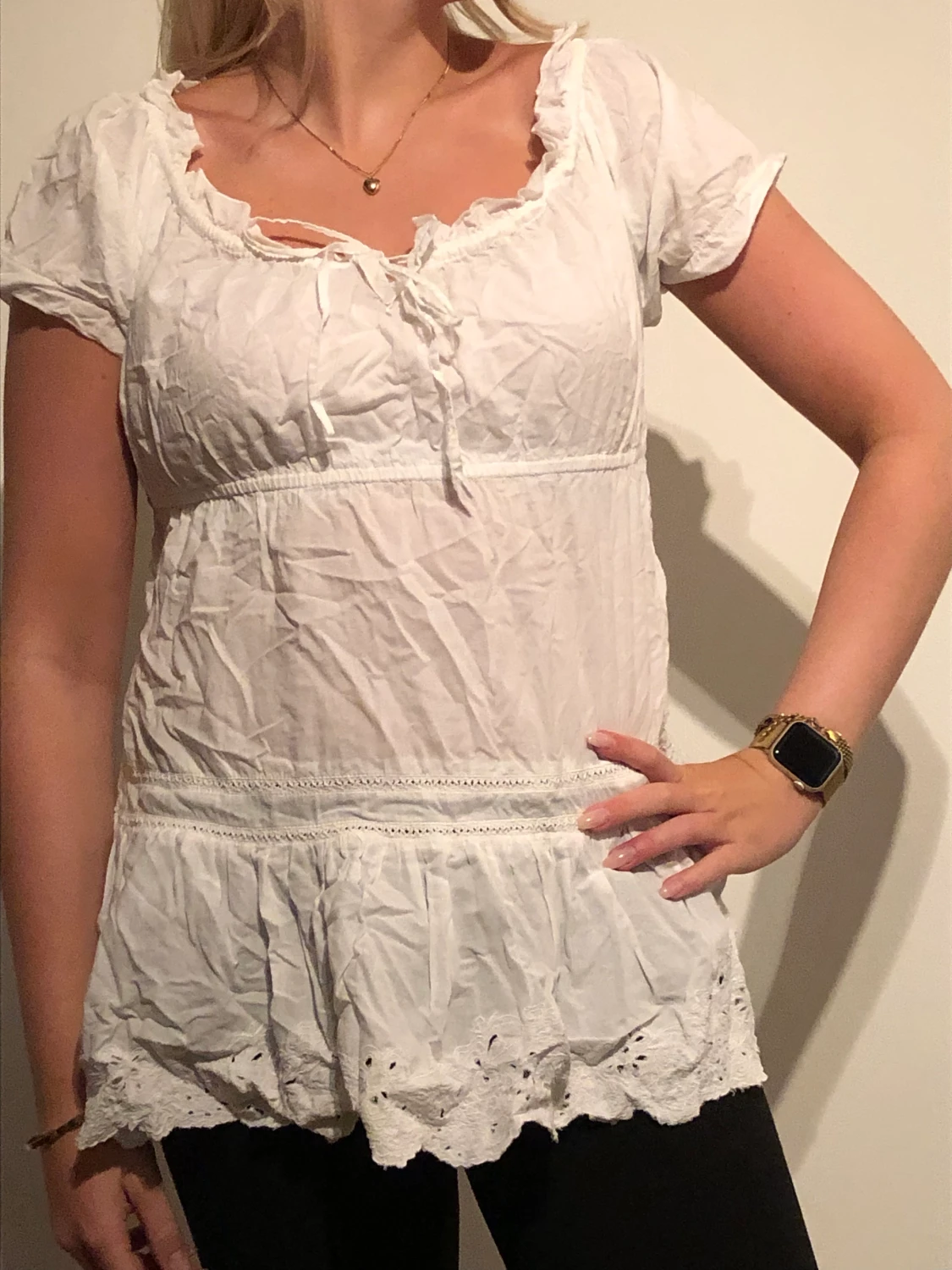 Vit romantisk blus. Är stl 44/46 men känns mindre ca stl M. Endast 25 kr plus porto. Har gjort stor rensning och säljer ut billigt. Om du vill köpa flera plagg hör av dig innan så kan jag ordna med samfrakt.