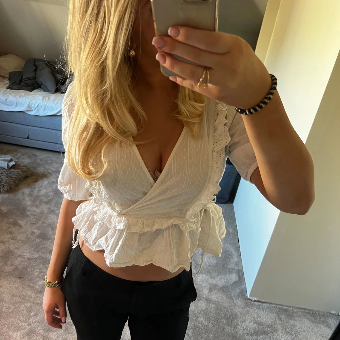 så så snygg men kommer inte till användning 🙃svår att visa på bild - men ganska kort(typ till naveln), v ringad med snören som man knyter på sidorna. lite puffiga armar. passar S-M