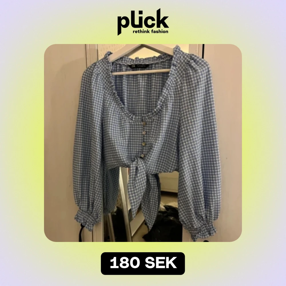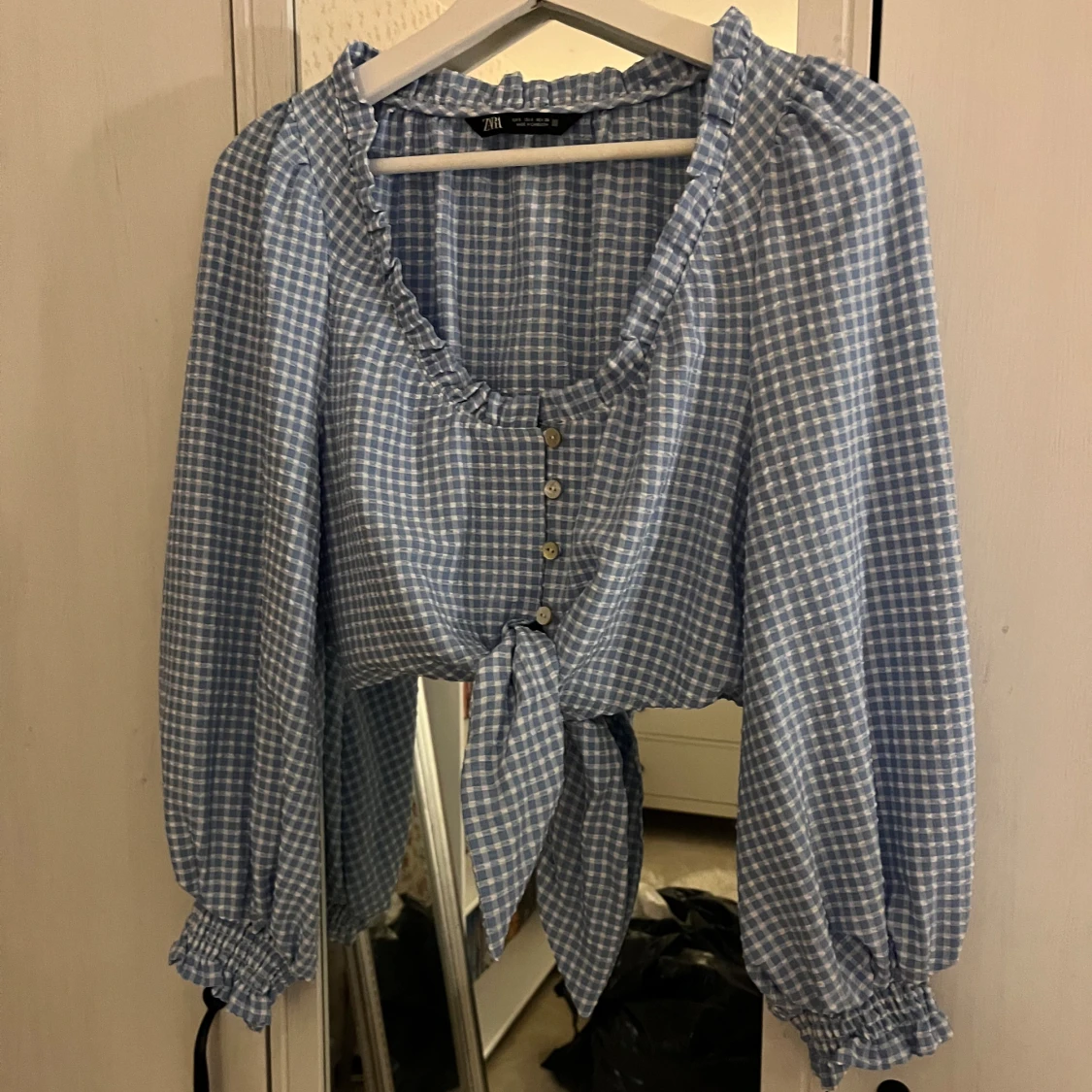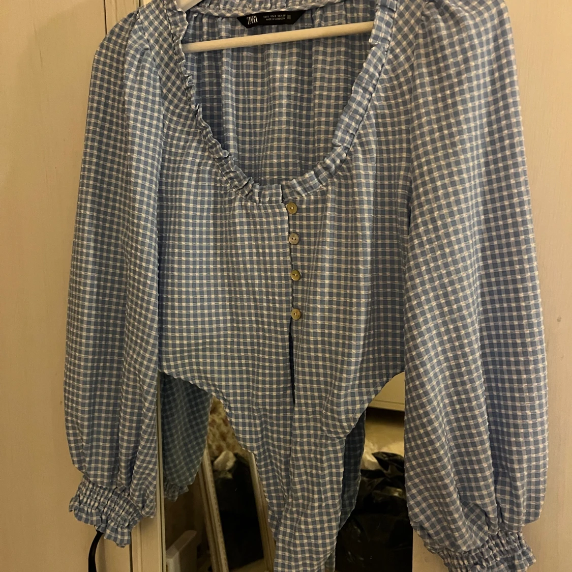 En superfin blåvit gingham knytblus med knappar framtill och smock upptill och vid ärmarna samt volang vid ärmslut från Zara i strl S!💓