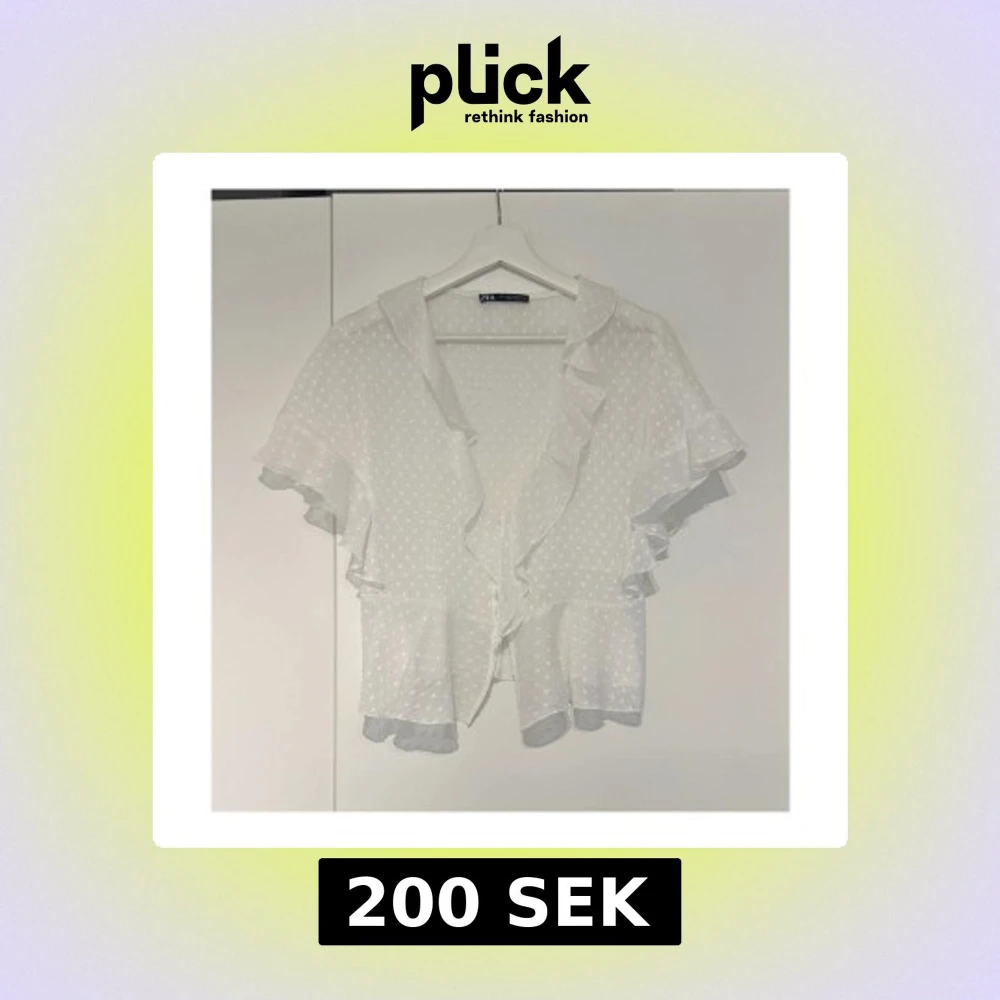 Supersöt vit blus från Zara med prickigt mönster, volangdetaljer längs ärmar och framkant samt v-ringning. Blusen har korta ärmar och knappar framtill. Använd få gånger.