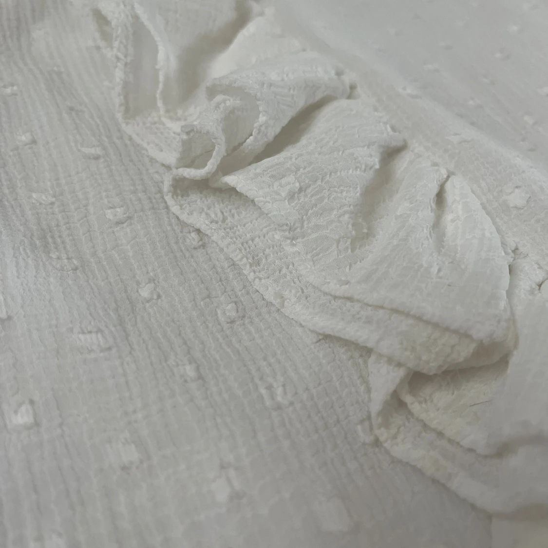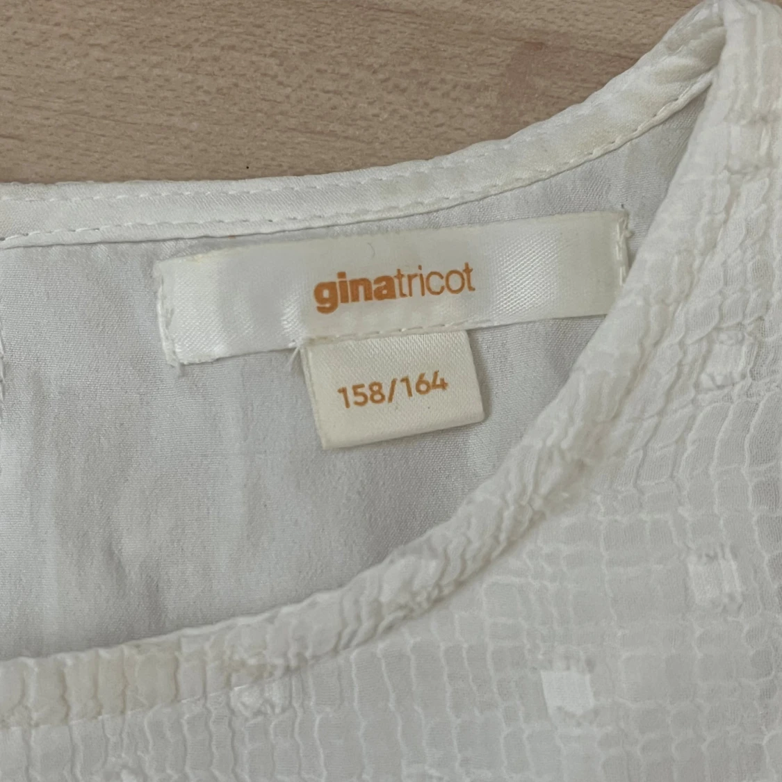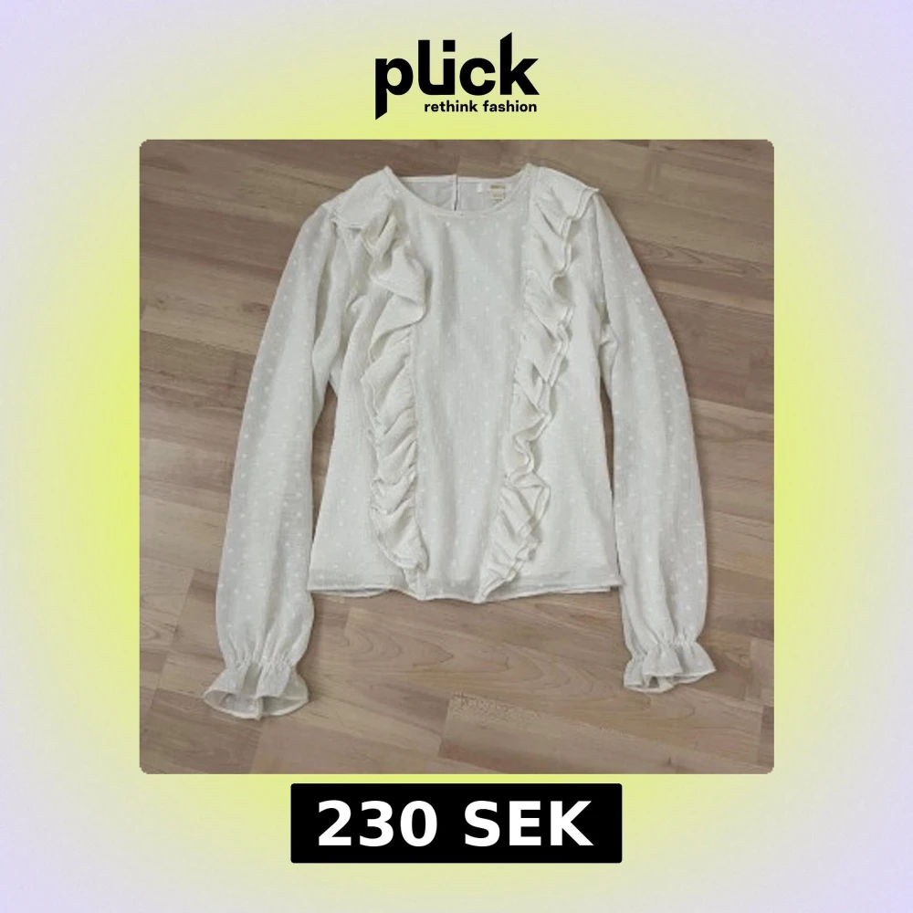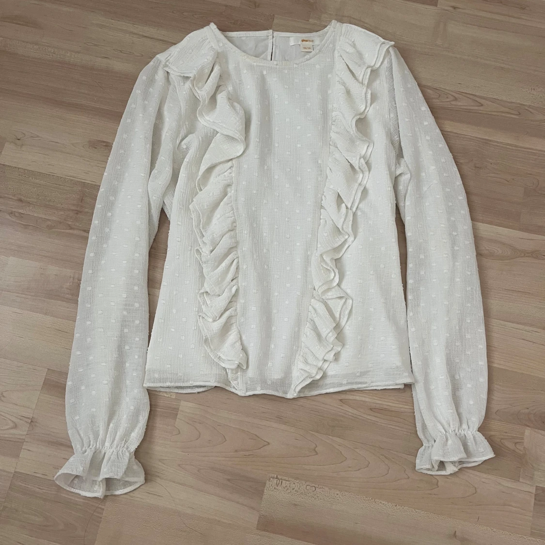 Vit blus från Gina Tricot med volanger. Långärmad med lite puff vid ärmslutet och rund halsringning. Funkar som strl XS