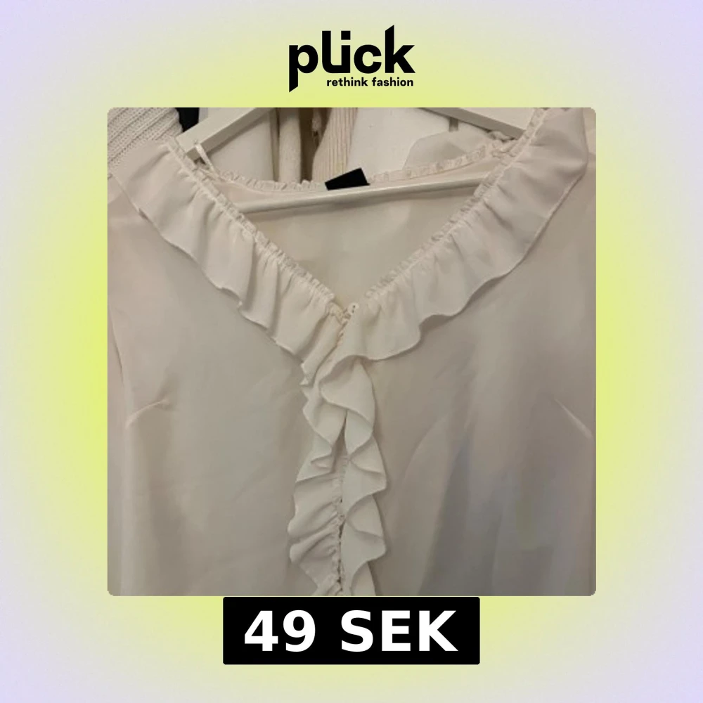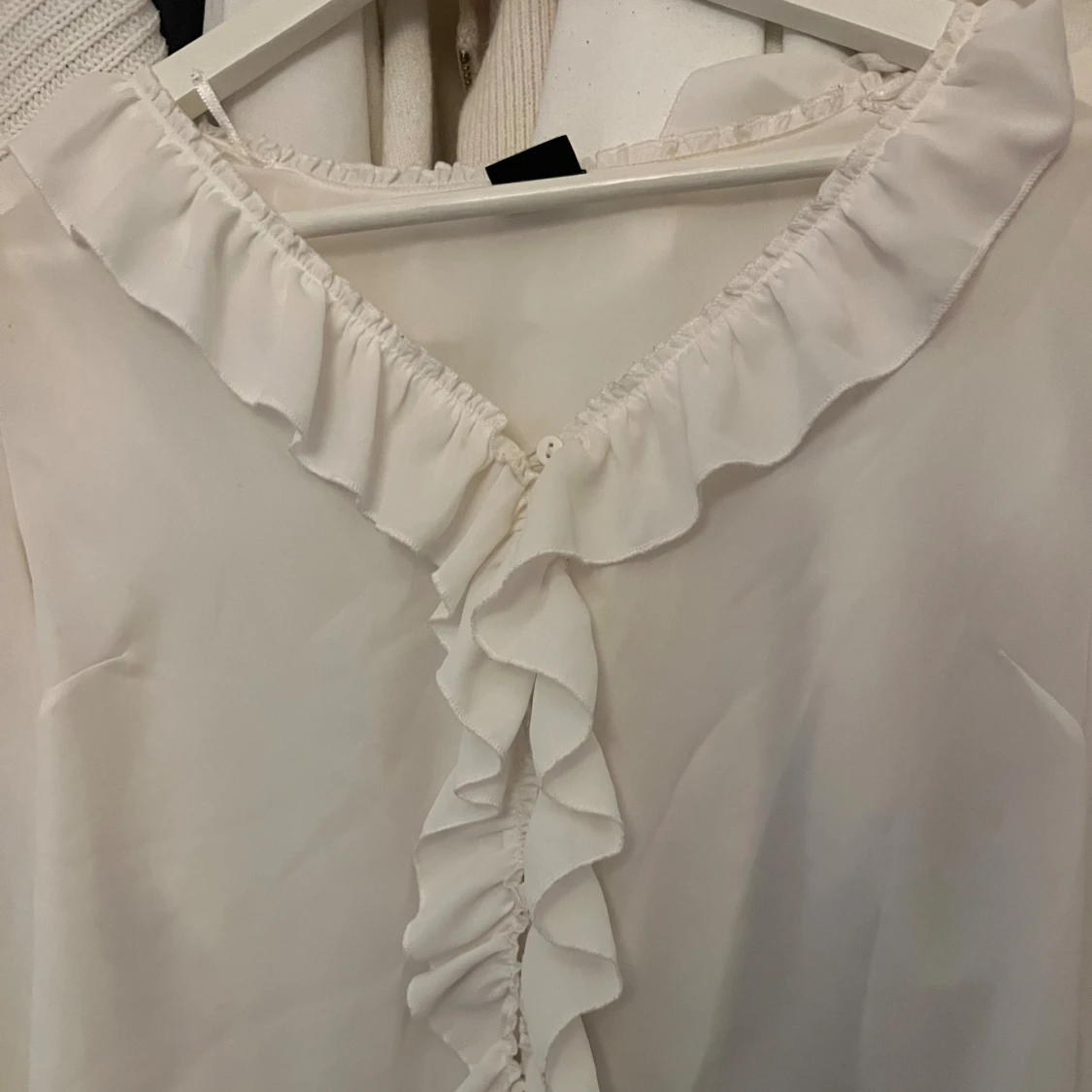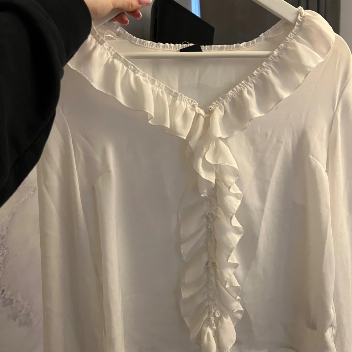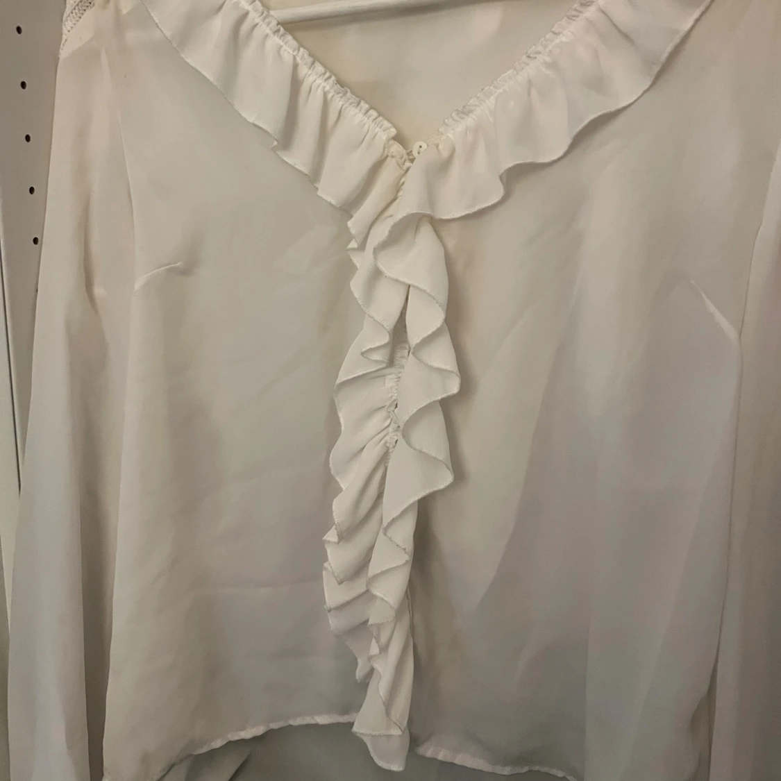 vit blus med knappar och volanger fram till, skriv vid fler bilder eller frågor