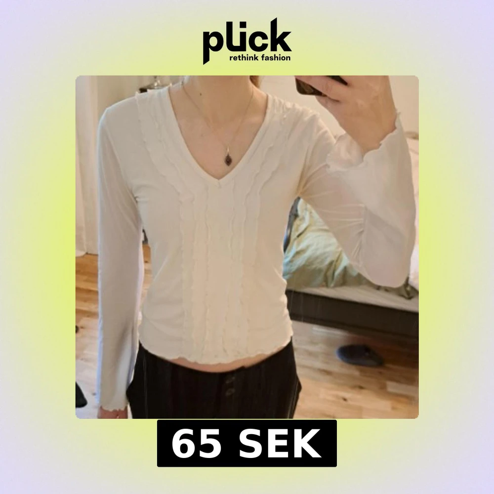 Vit långärmad topp från Flash med v-ringning och dekorativa vågiga sömmar framtill. Tyget är i mesh och därav är toppen lite genomskinlig. Men tröjan har dubbla lager framtill så den inte är genomskinlig där. Om ni vill se fler bilder eller har en fråga är det bara att höra av sig <3