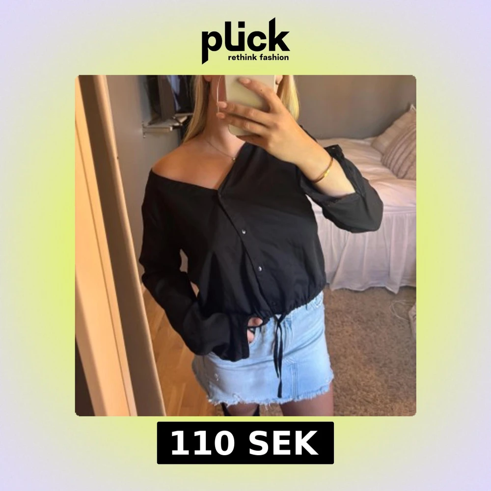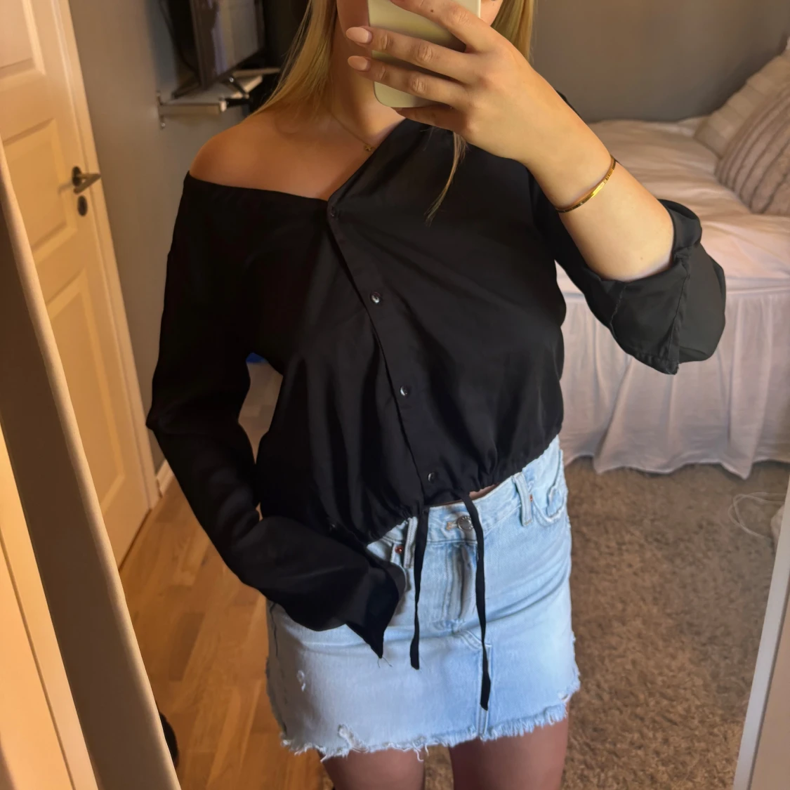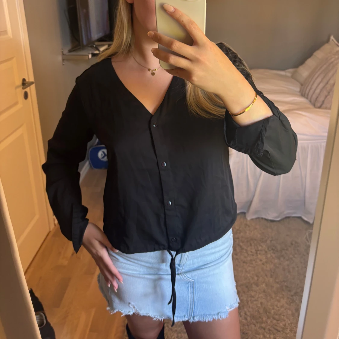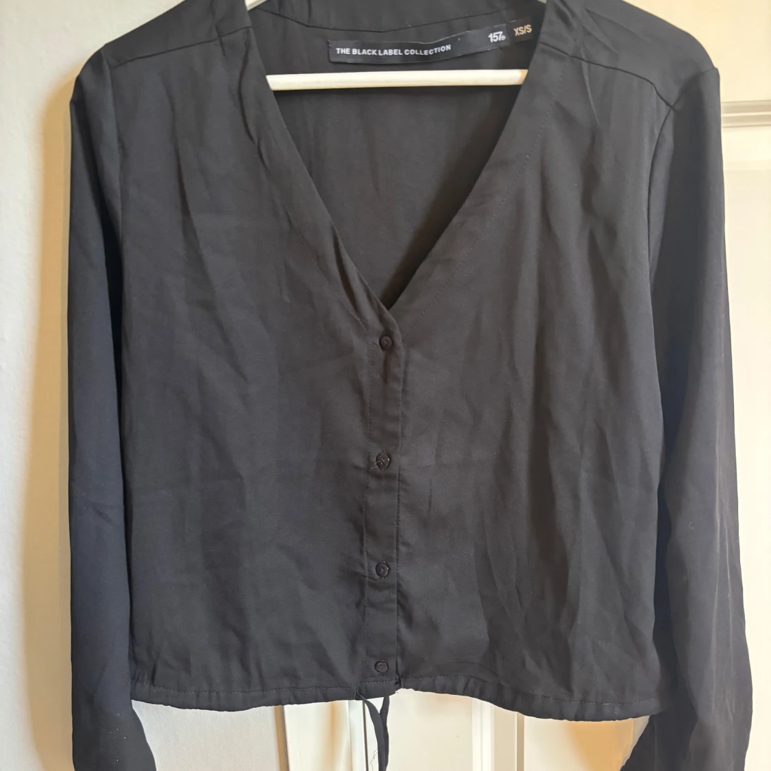Svart långärmad blus med v-ringning och knappar framtill från The Black Label Collection av lager 157. Blusen har en dragsko i midjan för en snygg passform och kan bäras offshoulder för en trendig look. Perfekt till jeans eller kjol.