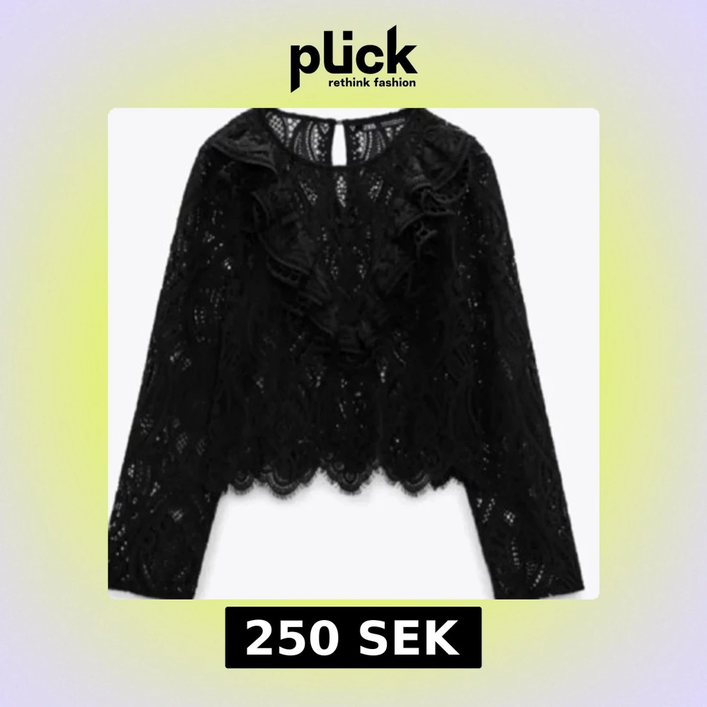 Supersnygg svart blus i spets med långa ärmar och volangdetaljer framtill. Passar till allting och är en extra fin tröja💞