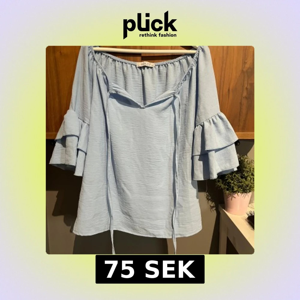 Supersöt ljusblå blus med offshoulder-modell och volangärmar i två lager. Blusen har knytband framtill och en luftig, lätt struktur. Perfekt för dig som gillar romantiska och trendiga detaljer.