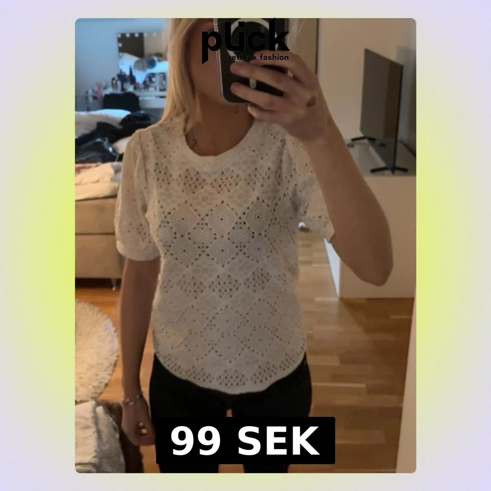 Säljer en vit blus med broderade hålmönster och puffiga korta ärmar. Blusen har rund halsringning och är gjord i ett lätt, luftigt material som känns som bomull.