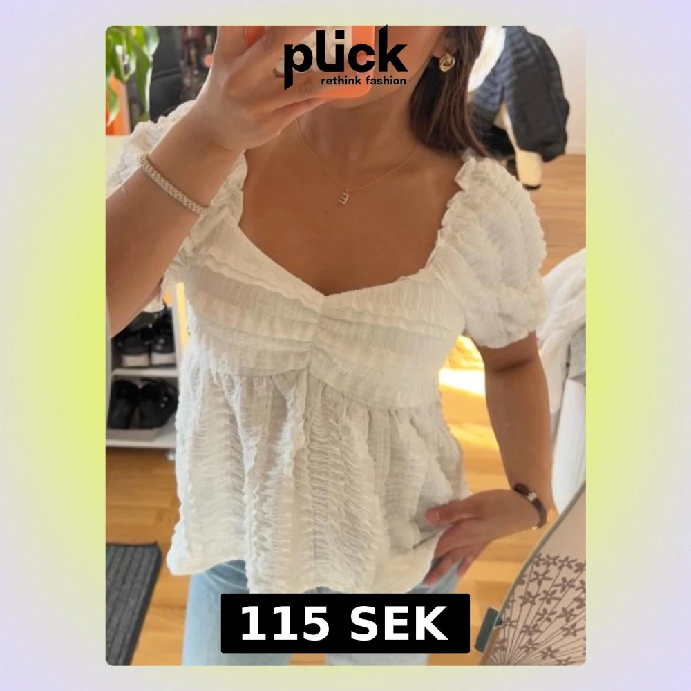 Supersöt vit blus med puffärmar och smockad struktur. Blusen har en djupare urringning och volangdetaljer över bysten och ärmarna. Tillverkad i ett lätt, krinklat tyg som ger en luftig känsla. Perfekt att styla med jeans eller kjol för en trendig look. HELT NY