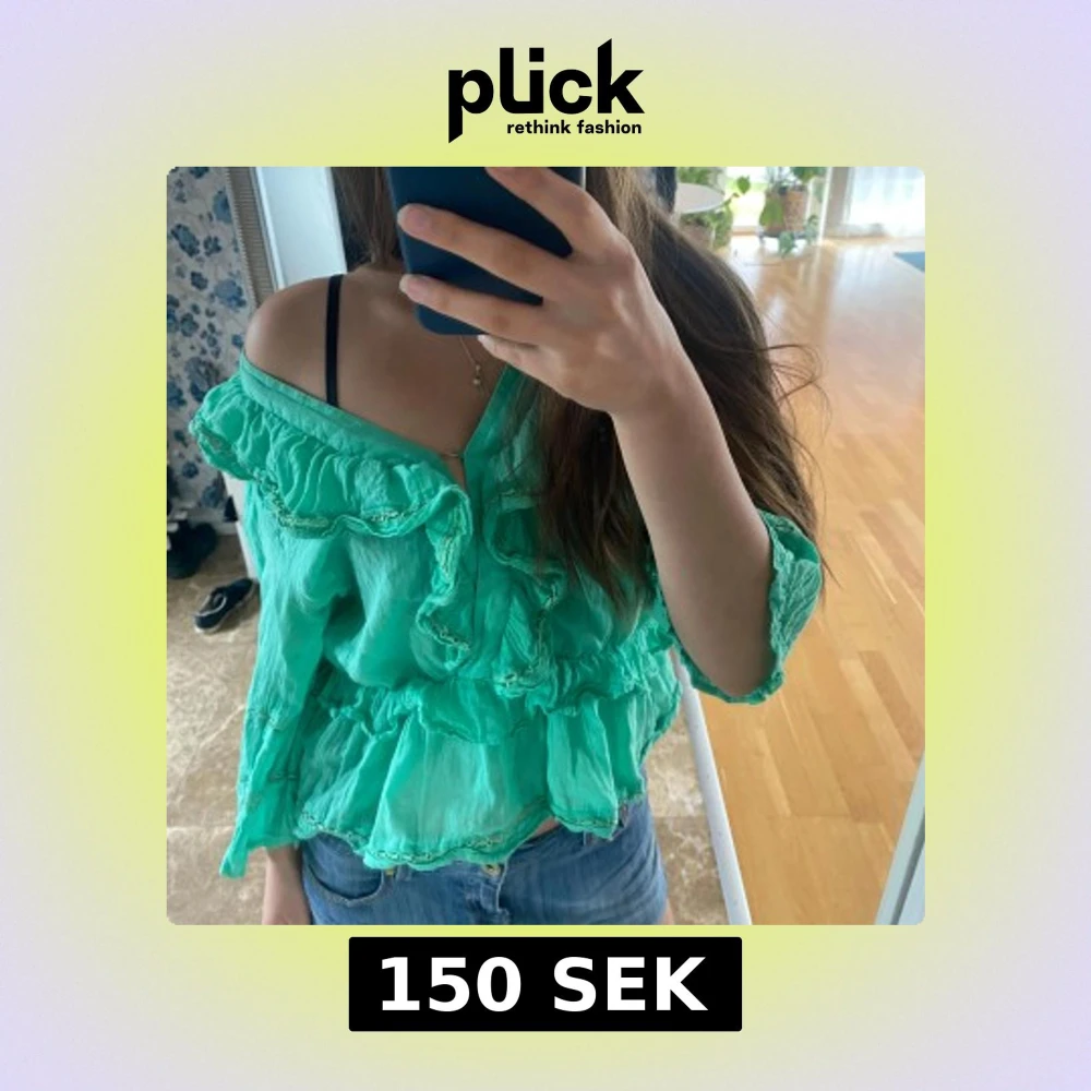 Supersöt turkos blus med volanger och offshoulder-look. Blusen har v-ringning och långa ärmar. Perfekt för dig som gillar romantiska detaljer och en luftig känsla.