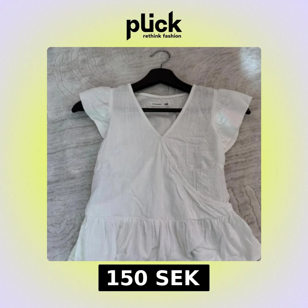 Supersöt vit blus från Terranova i storlek XS. Blusen har omlottdesign med v-ringning, volang nedtill och korta ärmar. Tillverkad i lätt bomullsmaterial som känns luftigt och fräscht. Perfekt för varma dagar och ger en clean och fräsch vibe.
