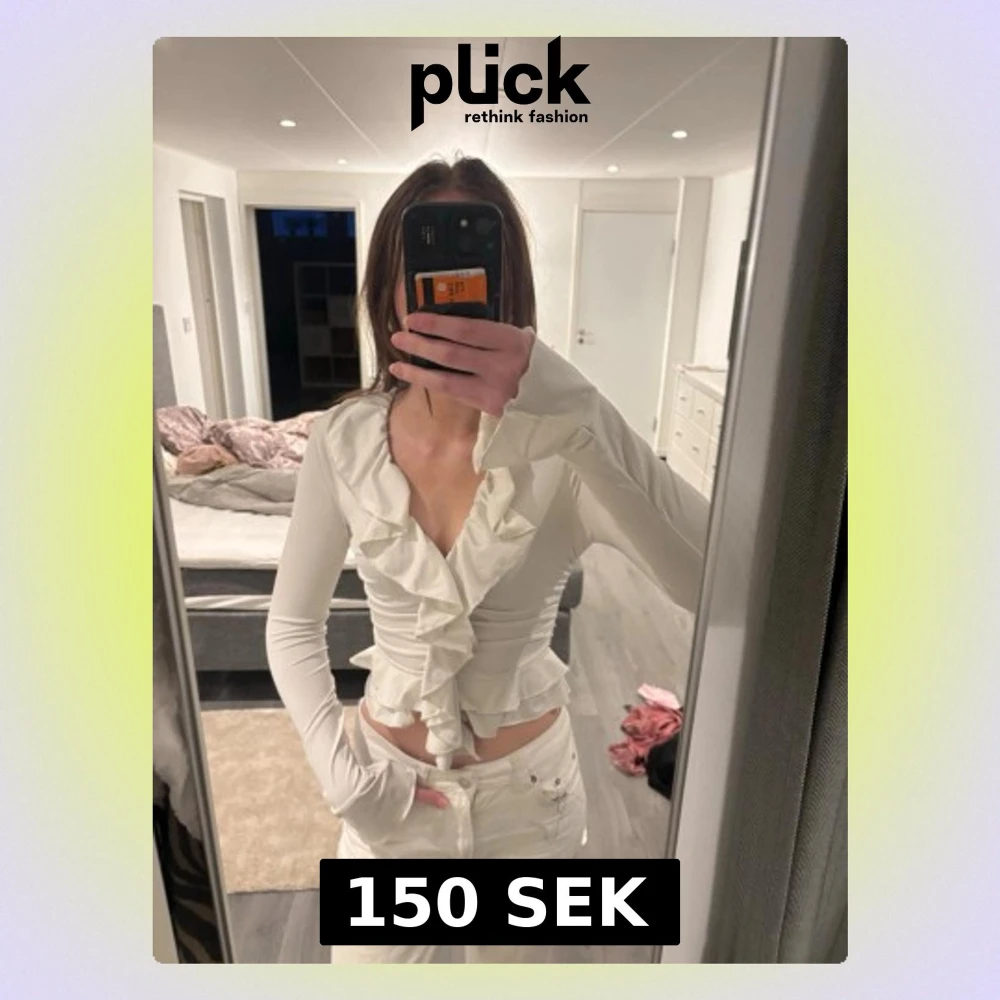 Trendig vit blus med långa ärmar och volangdetaljer längs urringningen och framtill. Figurnära passform och knytning i midjan. Säljer denna pga dålig användning, sitter som xs och s❤️
