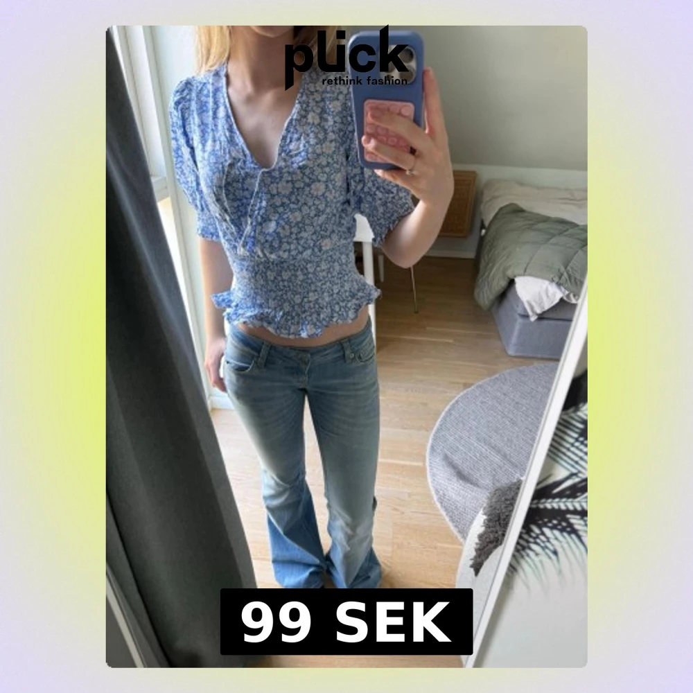 Söt blus i ljusblått med vitt blommönster och volangdetaljer. Modellen har v-ringning, smockad midja och trekvartsärm med puff. Tunn och luftig, perfekt till jeans eller kjol. Materialet känns som viskos eller polyester.