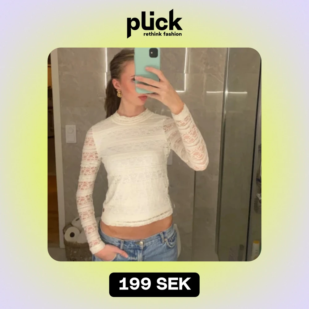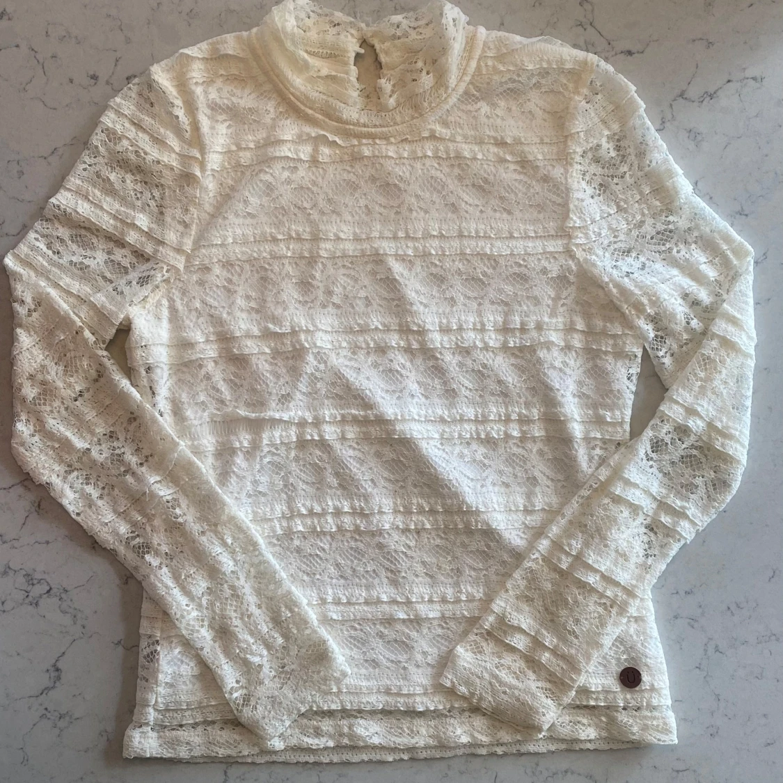 Vit spetstopp i gott skick. Har ett undertyg som täcker mage och rygg, armarna är genomskinlig spets.