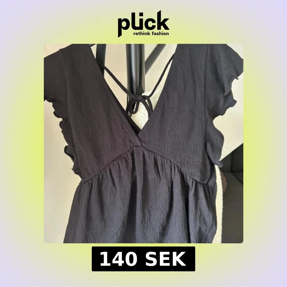 Supersöt svart kort top med omlott och knyt i ryggen. Topen har volangdetaljer på ärmarna och längs nederkanten, samt en djup v-ringning. Materialet är lätt och har en krinklad struktur som ger en avslappnad vibe.