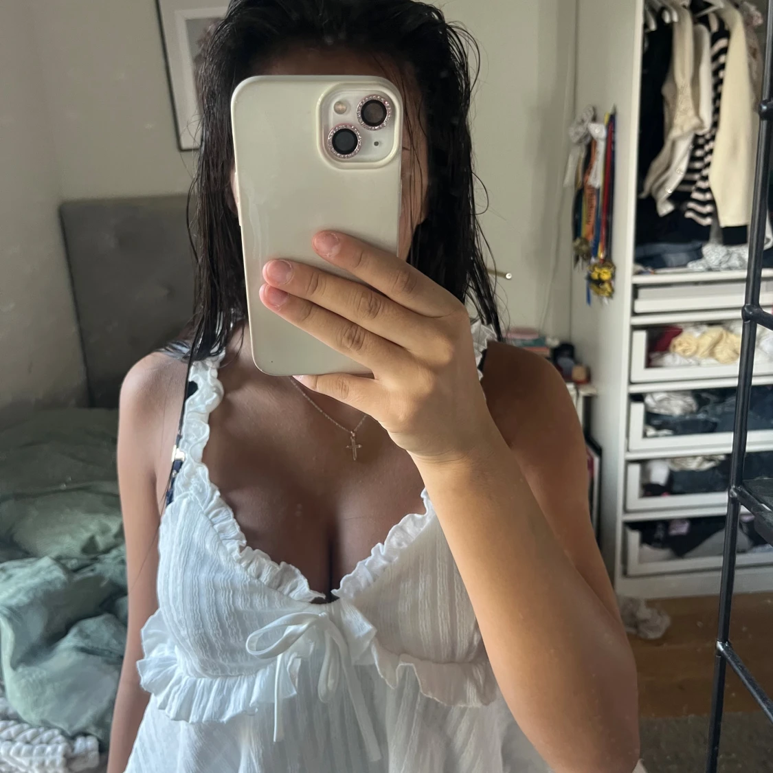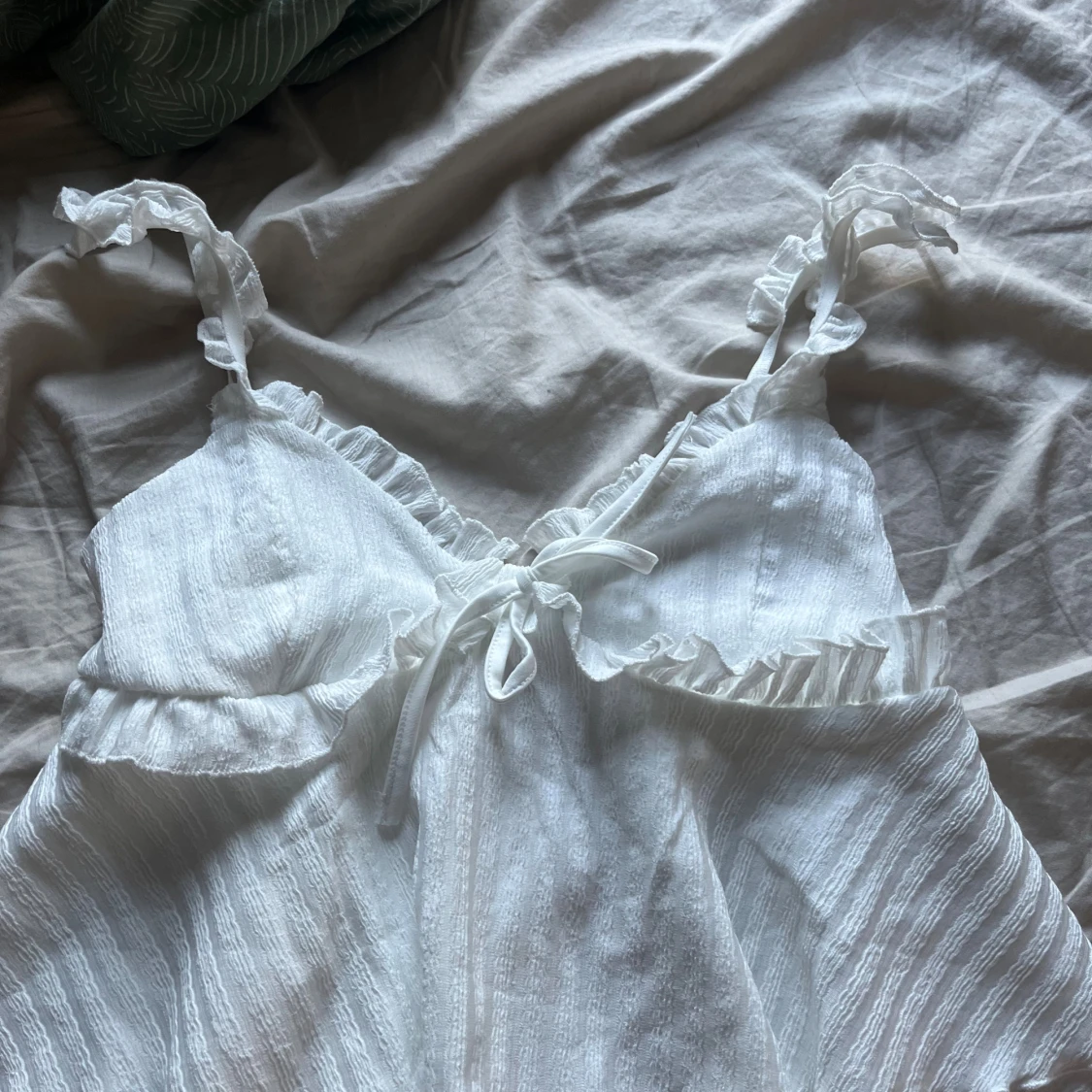 Supersöt vit topp med volangdetaljer och knyt framtill. Aldrig använt, köpte från Plick an en annan användare för 100kr🥰 pris kan diskuteras