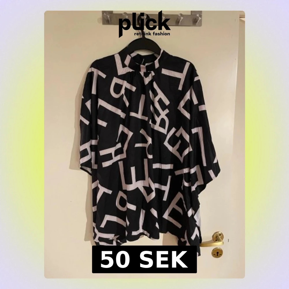 Unik svart blus med vitt grafiskt bokstavsmönster och hög krage. Blusen har vid passform och trekvartsärm, vilket ger en avslappnad och trendig look. Perfekt för dig som gillar statement-plagg och vill sticka ut i mängden.