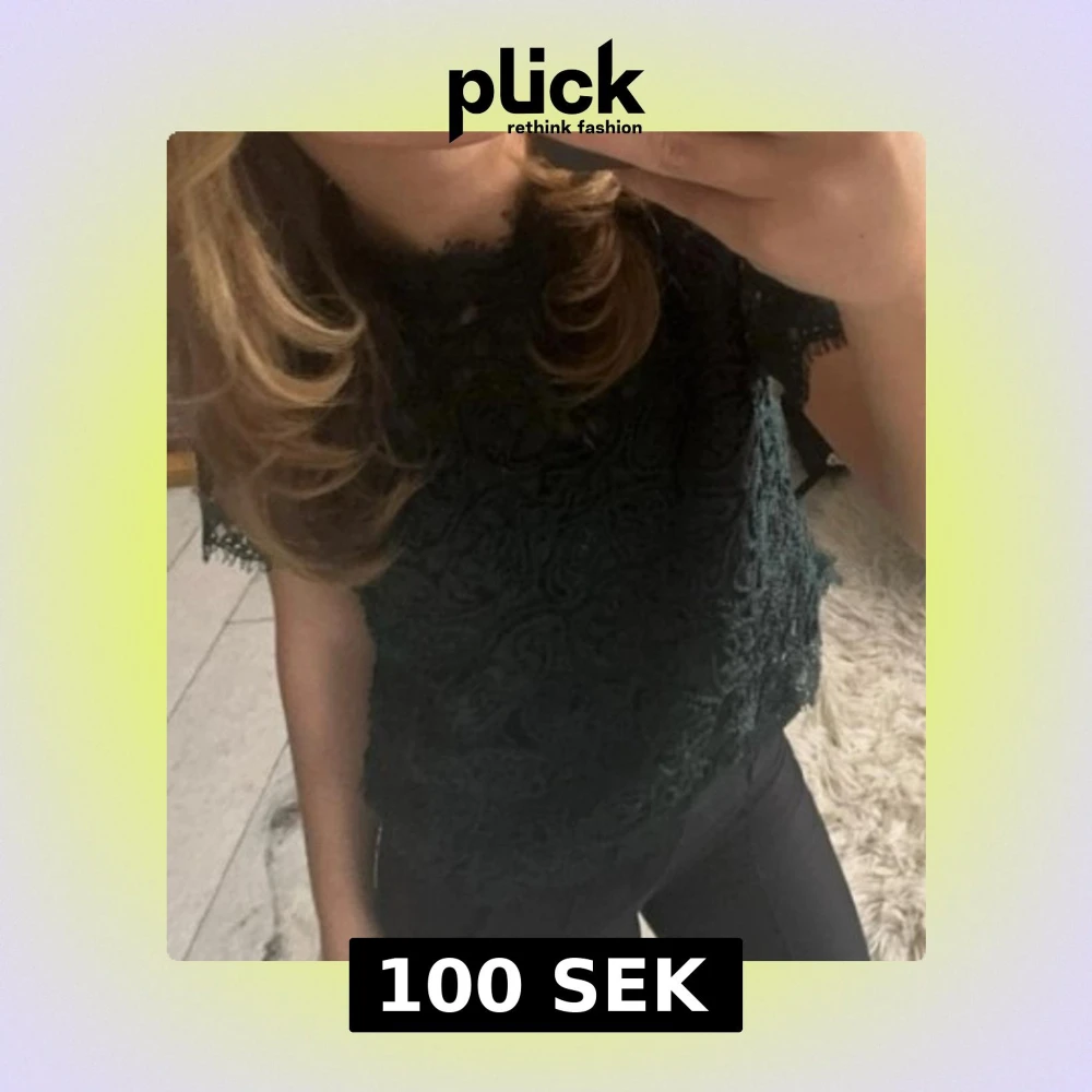 Säljer en mörkgrön blus med vacker spets och korta ärmar. Blusen har en hög hals och fina detaljer längs kanterna. Perfekt för dig som gillar romantisk stil och vill ha något extra till din outfit. Står Medium, men den sitter bra på mig som är 160.
