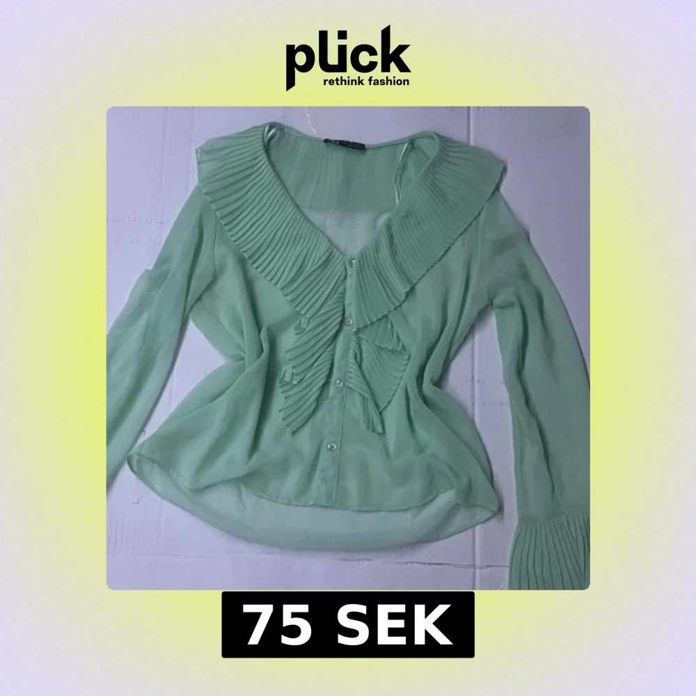 Fin blus turkos grön långarmad med volanger runt handleden, halsen, nacken och lite ner med knappar som glimrar, blusen är i storlek S ifrån Zara och färgen är lite mer synlig i verkligheten än på bilderna men min kamera är inte så bra.