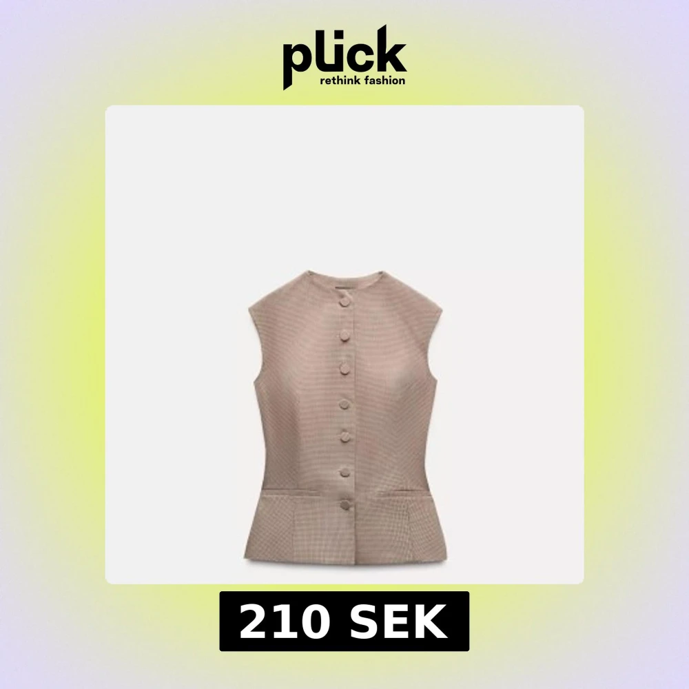 Säljer en beige väst med diskret rutigt mönster och höga axlar. ⚠️Har små sminkfläckar i kragen men absolut ingen som man lägger märke till, kan skicka fler bilder. Västen har en rak passform, ståkrage och stora klädda knappar framtill. Två fickor framtill ger en clean look. Perfekt att styla över en t-shirt eller skjorta.