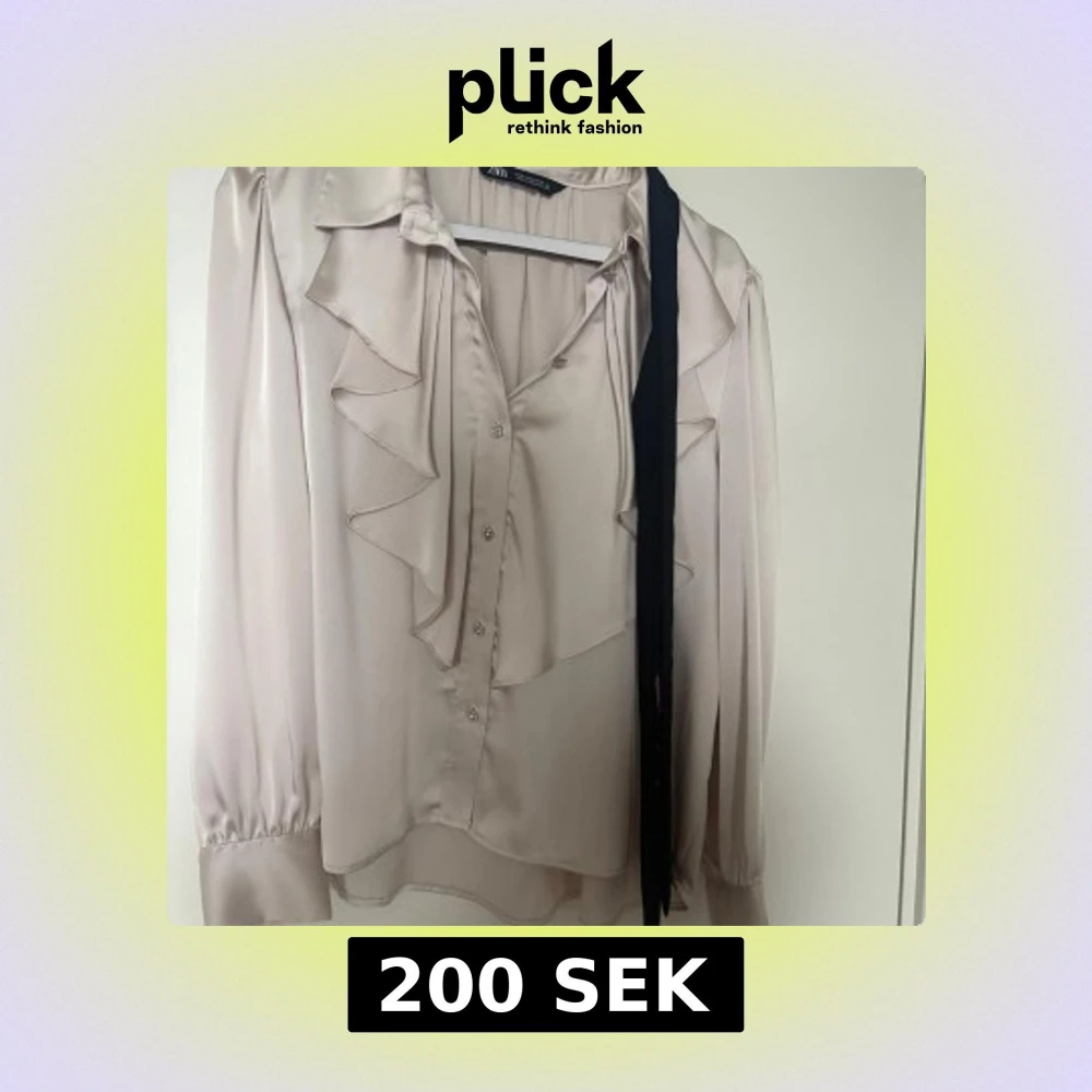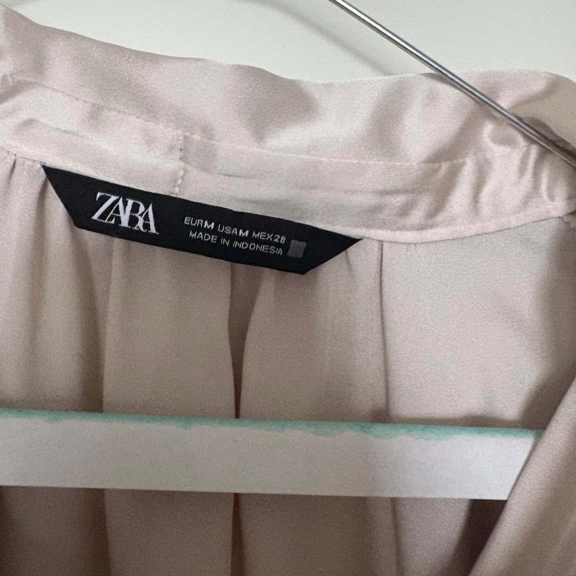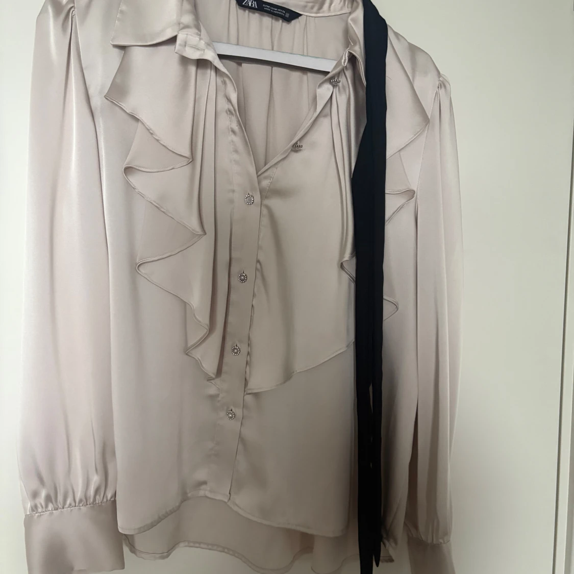 Supersnygg beige blus från Zara i glansigt satinliknande material. Blusen har volangdetaljer framtill, långa ärmar med pärlknappar och en svart rosett vid kragen. Perfekt för dig som gillar en chic och trendig look.