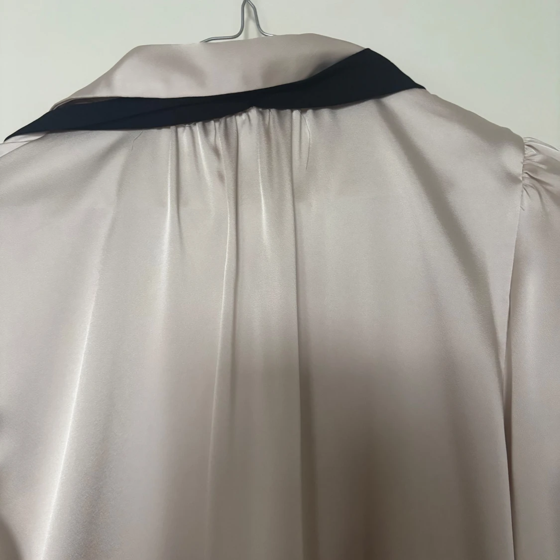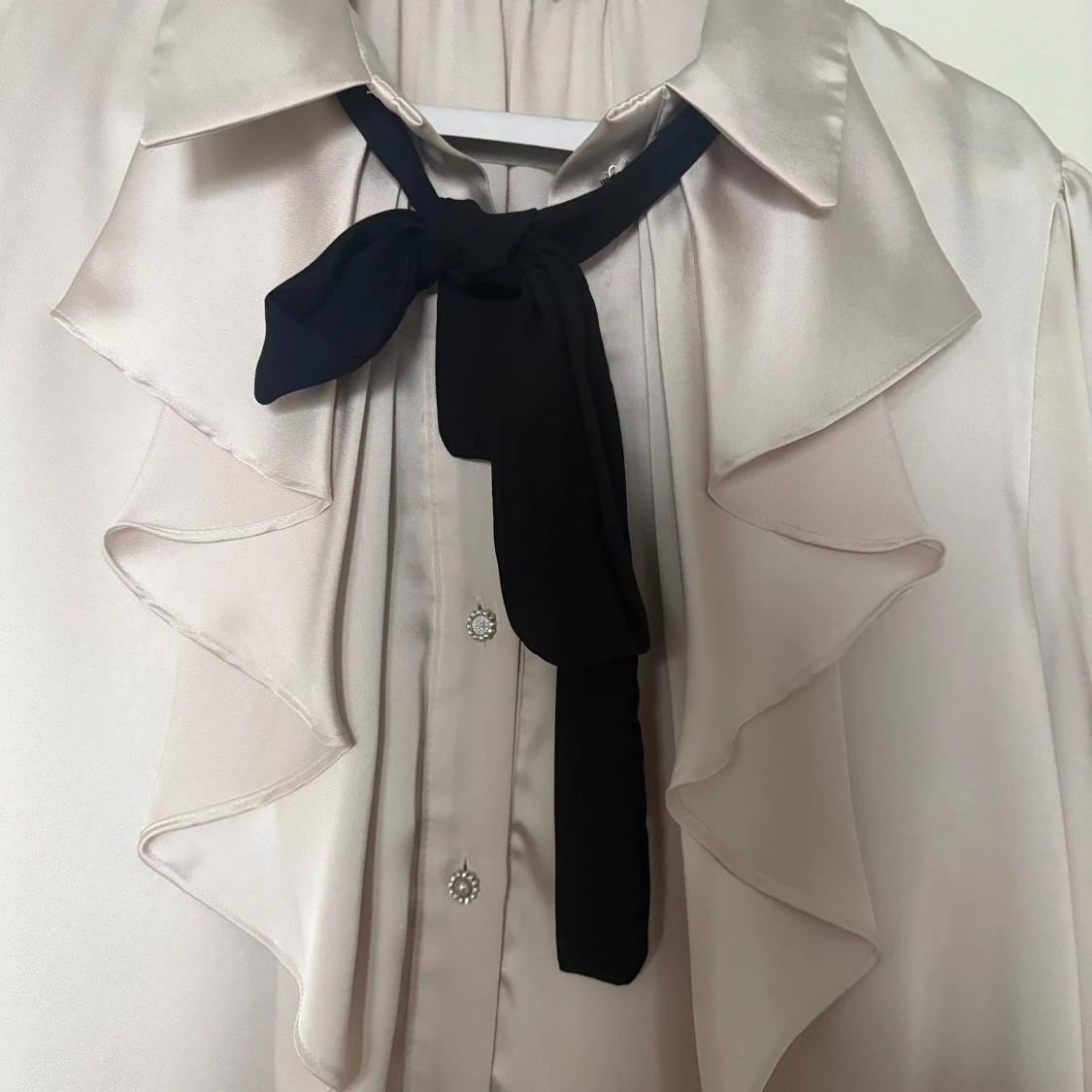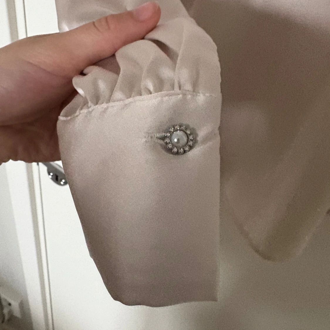 Supersnygg beige blus från Zara i glansigt satinliknande material. Blusen har volangdetaljer framtill, långa ärmar med pärlknappar och en svart rosett vid kragen. Perfekt för dig som gillar en chic och trendig look.