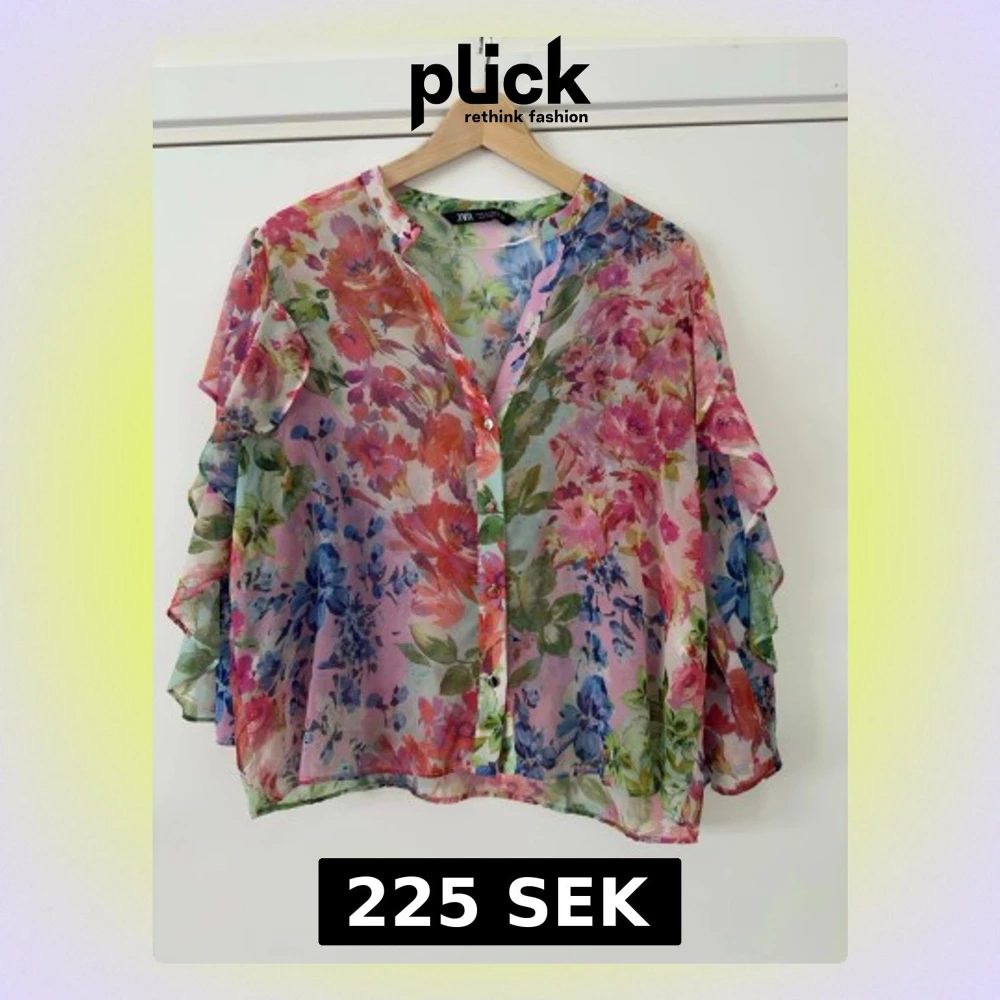 Blus i transparent material med färgglatt blommönster i rosa, blått, grönt och lila. Volangdetaljer längs ärmarna och knäppning framtill. Perfekt för dig som gillar romantisk och lekfull stil.