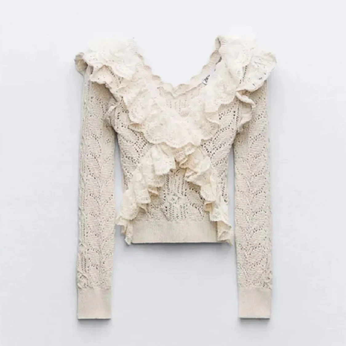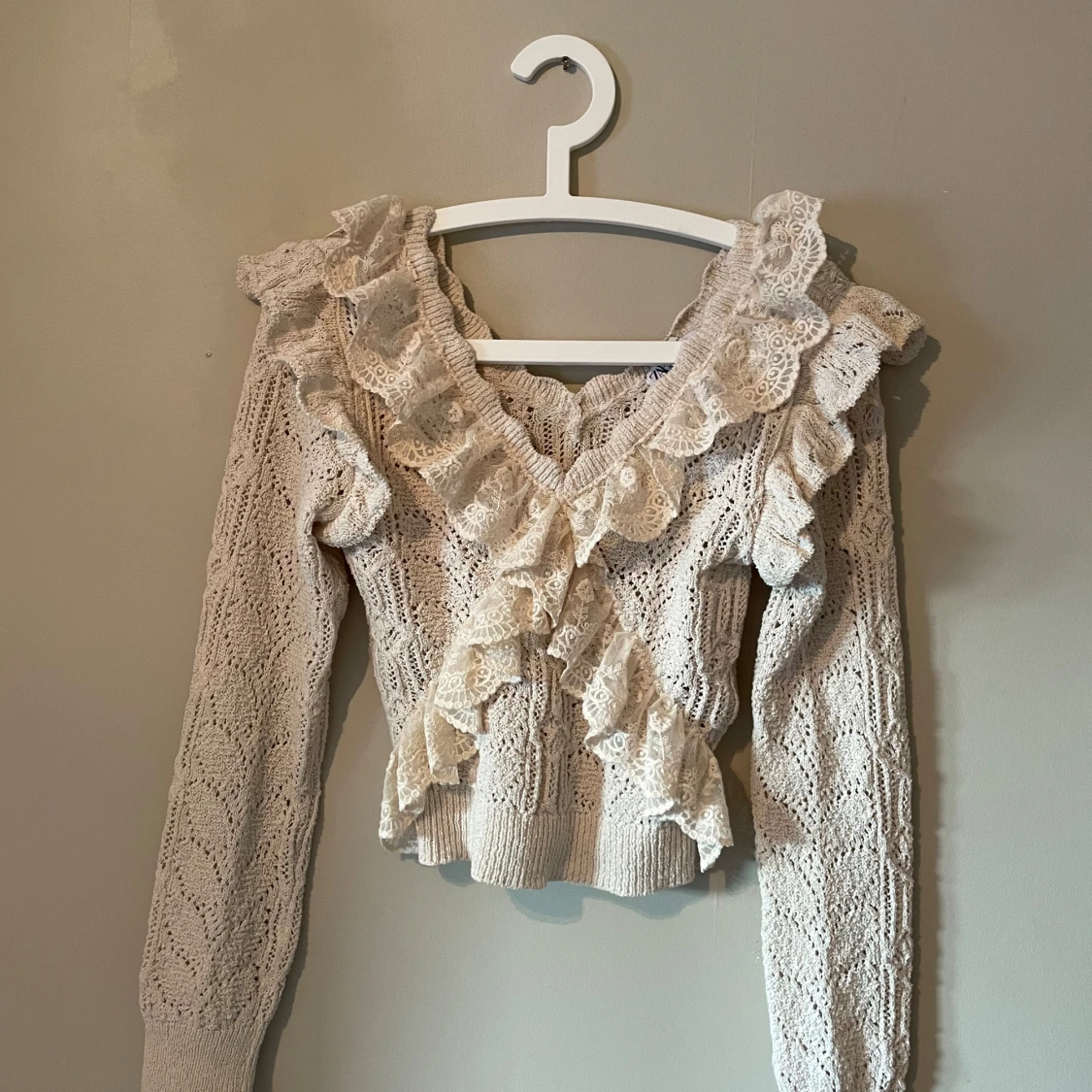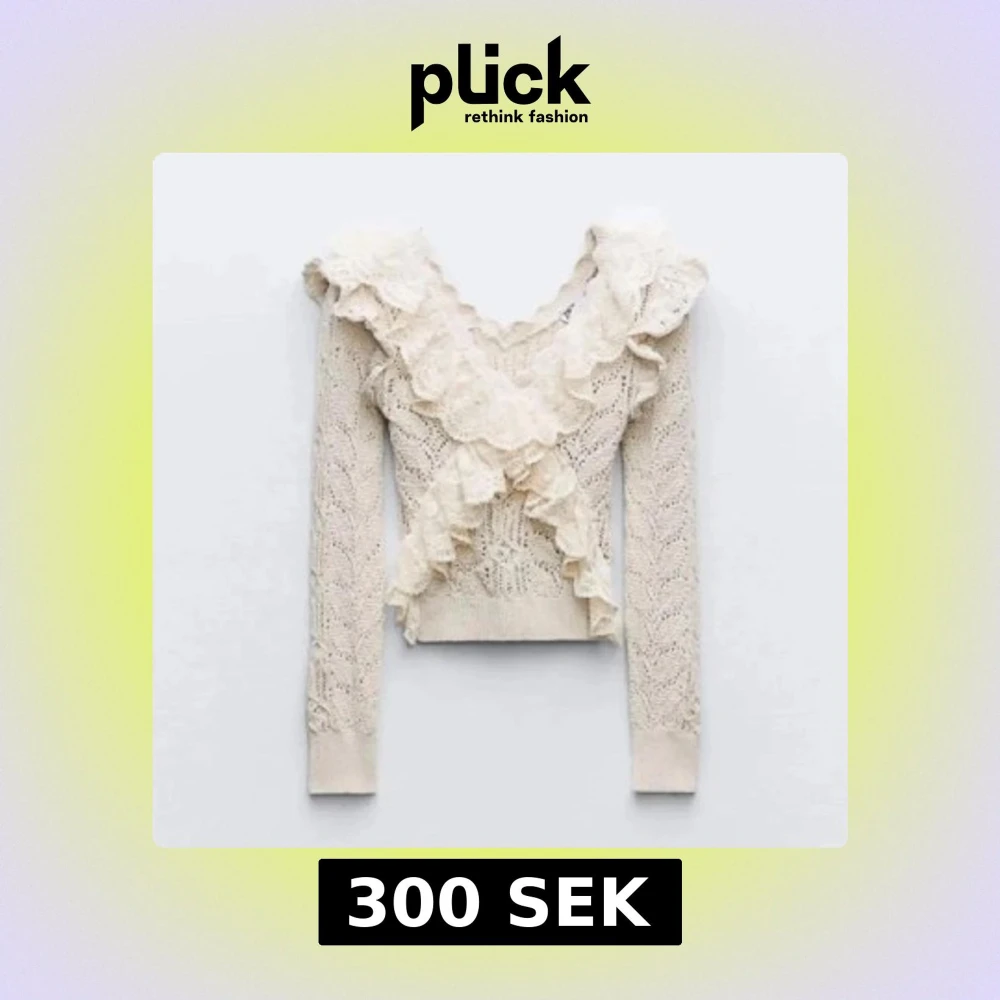 Säljer en söt beige stickad tröja med vackra volangdetaljer och v-ringning. Den är endast använd några få gånger. Perfekt för en tjejmiddag!!💖