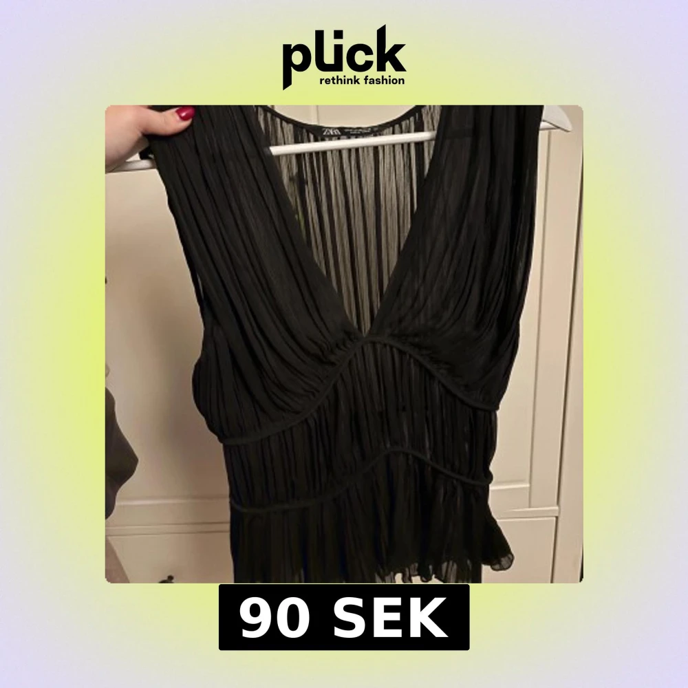 Snygg svart top från Zara med djup v-ringning och fransdetaljer. Perfekt för en kväll ute eller en speciell tillställning.