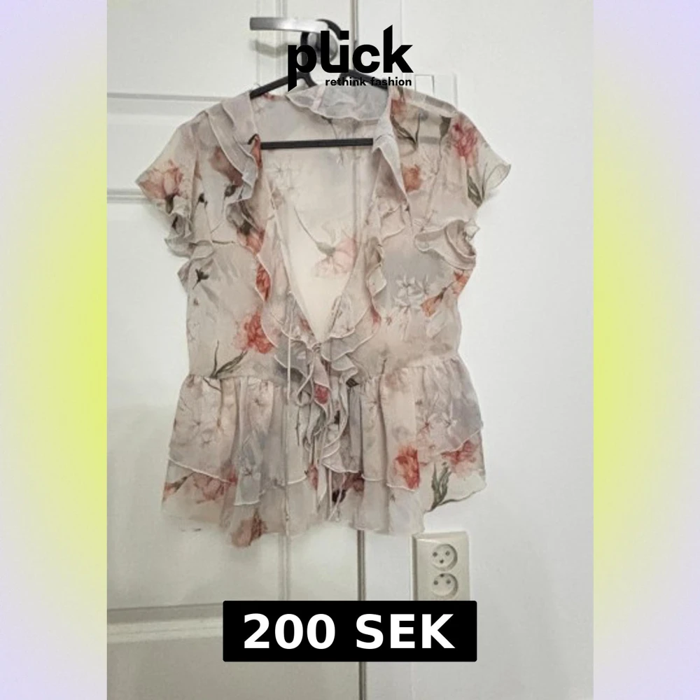 Blus från Zara i storlek S. Blusen är ljusbeige med blommigt mönster i rosa och grönt, har volanger längs halsringningen och axlarna samt snörning framtill. Materialet är tunt och luftigt.