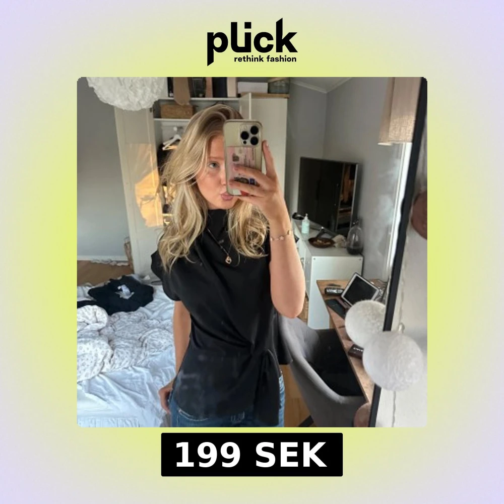 Säljer en elegant svart blus med knytning i midjan. Blusen har korta ärmar och en hög krage, vilket ger en stilren look. Perfekt för att klä upp en vardagsoutfit eller för en kväll ute.