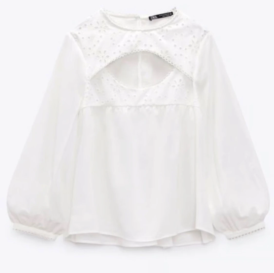 Supersöt vit blus från Zara med broderade detaljer och öppen framtill.