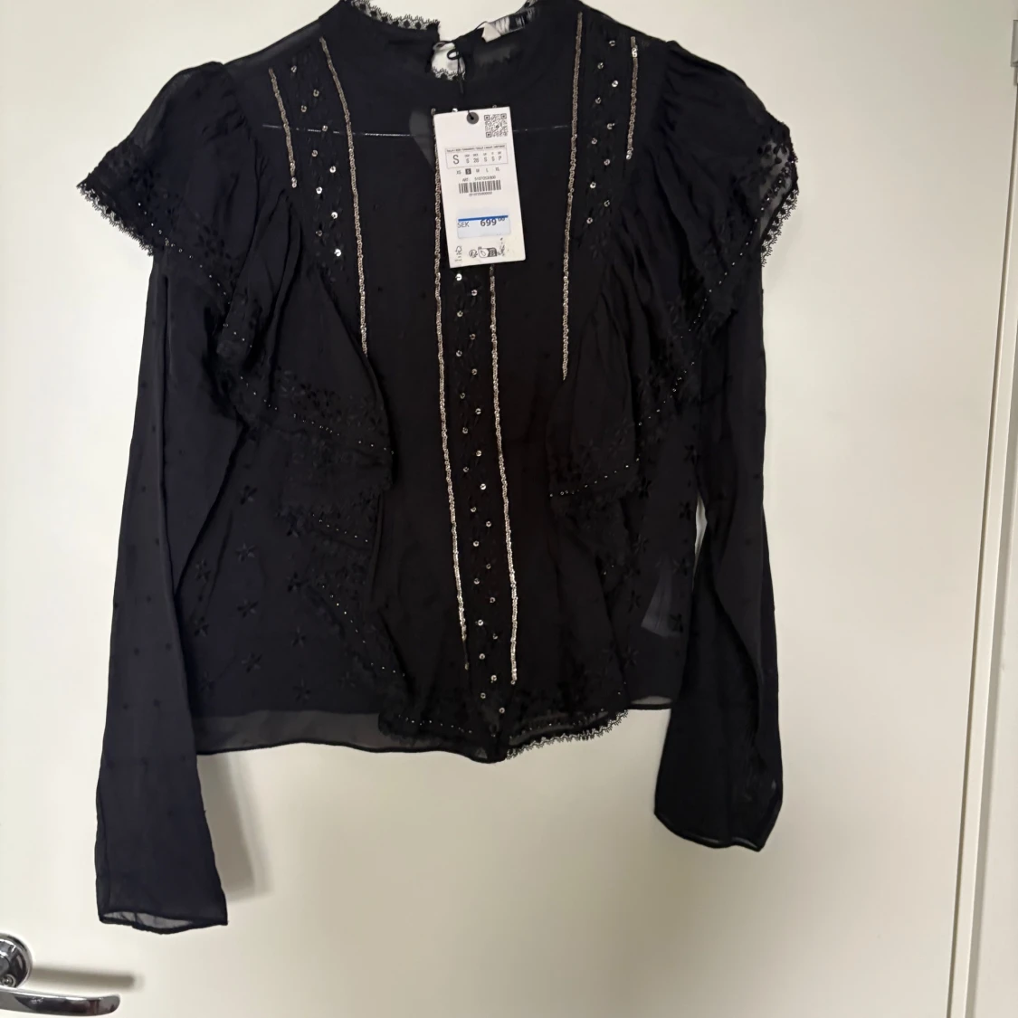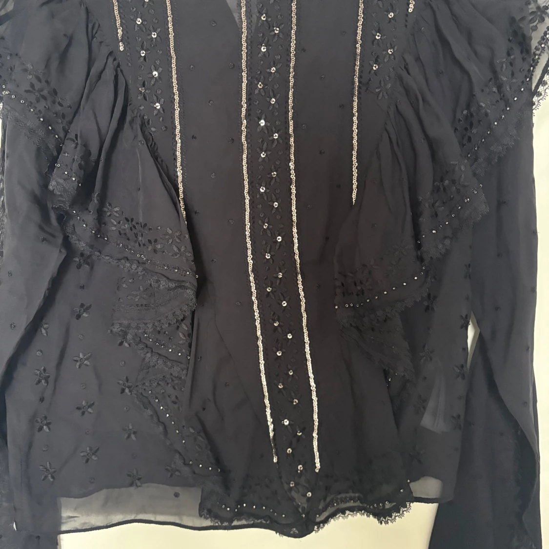 Supersnygg svart blus med transparenta partier, broderade blommor och glittriga paljettränder framtill. Långa ärmar med spets och volangdetaljer ger en romantisk vibe. Perfekt för dig som gillar unika detaljer och en lite lyxigare känsla.