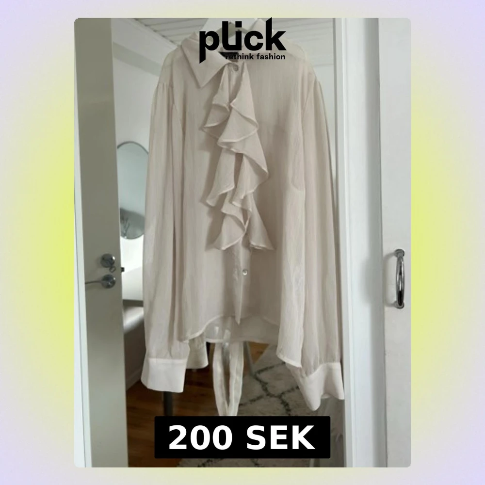 Stilren vit blus med stora volanger framtill och knytband i midjan. Jättefin till middag och sommaren, ganska tunt tyg.