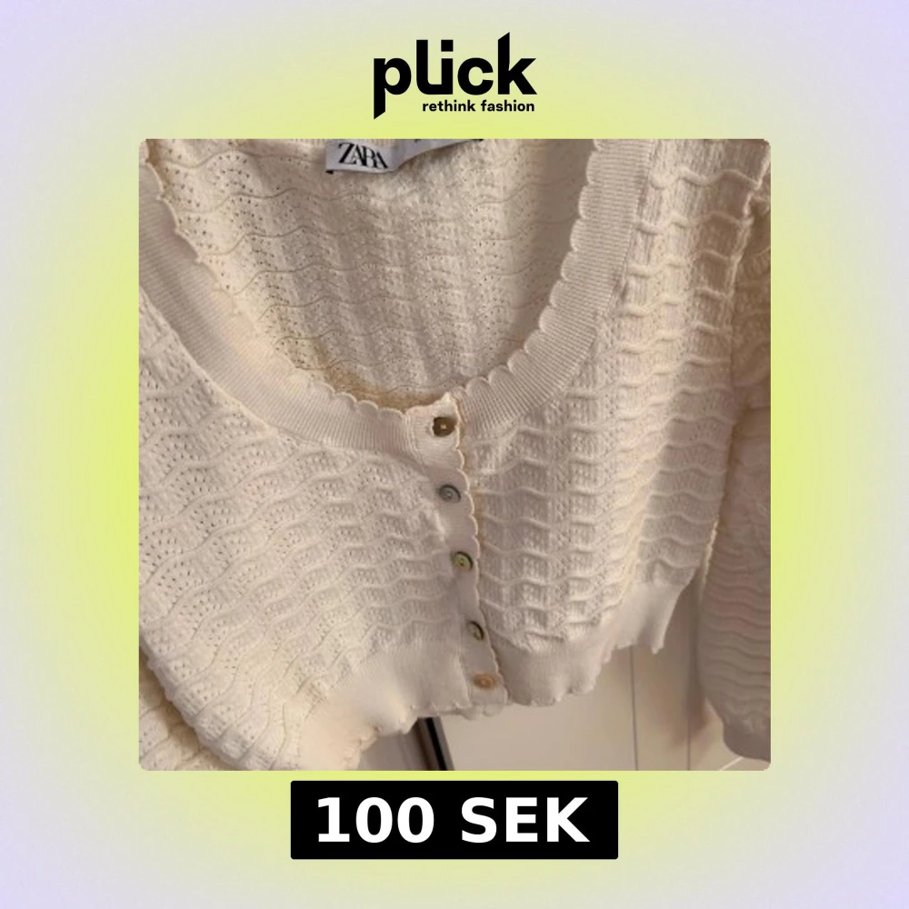 Superfin vit kofta från Zara med croppad passform och snyggt vågig kant vid halsringningen. Tröjan har ett stickat mönster, långa ärmar och knappar framtill. Perfekt att slänga över en topp för en trendig look.