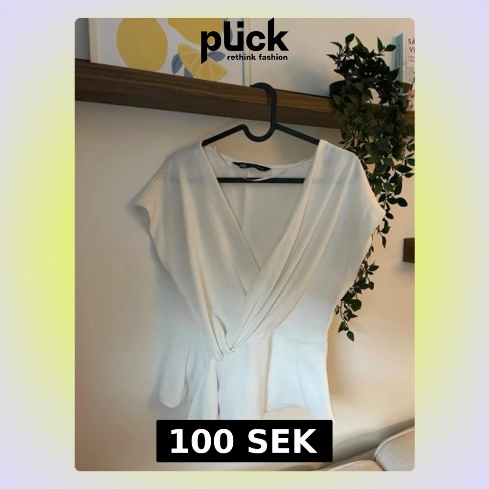 Stilren vit omlottblus från Zara med djup v-ringning och korta ärmar. Blusen har en lätt figursydd passform och faller snyggt över kroppen. Tillverkad i ett mjukt, tunt tyg som ger en elegant look.