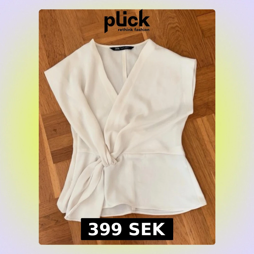 Säljer en stilren vit omlottblus från Zara med v-ringning och knytning i midjan. Blusen har korta ärmar och är tillverkad i ett mjukt syntetmaterial som ger ett elegant fall. Perfekt för dig som gillar minimalistisk och modern stil.